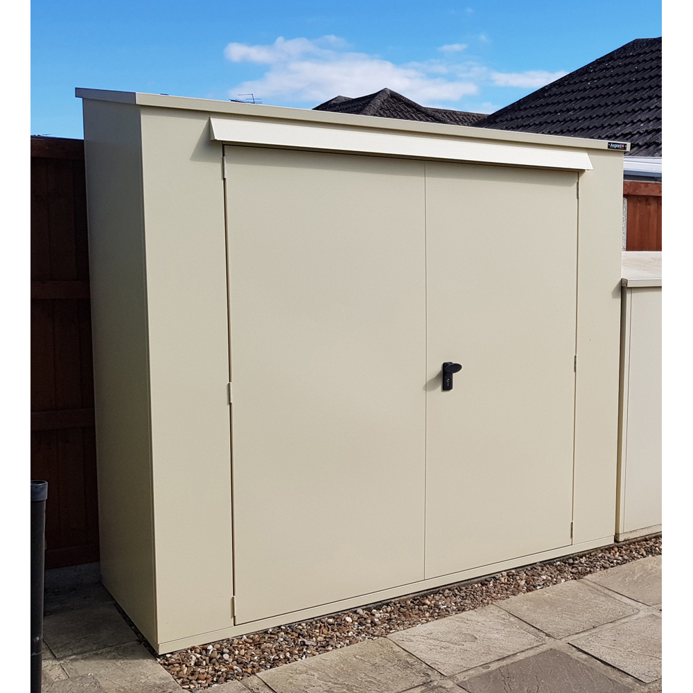 Set yourself up with serious storage using the Asgard Trojan Plus Double Door Cream Caravan Storage Shed 7 x 3ft. This tall, extra-wide and all-metal secure combi shed is designed to store tools and bikes outside of your holiday home or static caravan, with plenty of room for larger items like ladders, rakes, and even bikes. Built from thick, weatherproof, galvanised steel, this shed is built to last. It features stainless steel hinges, an integral metal floor, and a large double door for easy access. When it comes to security, this shed doesn’t mess around. The locksmith-approved five-point locking system includes deadbolts, a pick and drill-resistant lock, and an anti-thief snap-off handle to help stop tampering. It’s fully ventilated too, with a built-in system that helps reduce condensation and keeps airflow moving. Please note that this listing is for the unit only. Accessories shown in the picture are not included; they are just for illustration. You must place this shed on a solid surface like concrete or tarmac. It’s not suitable for grass, soil, hardore, or eco bases. The base size recommended is 2350 x 1150mm. Internal measurements: 2105mm (back height) / 1995mm (front height) x 900mm (depth) x 2150mm (width).