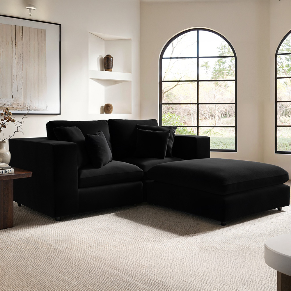Solace+Co Asher 3 Seater Black Velvet Sofa with Footstool