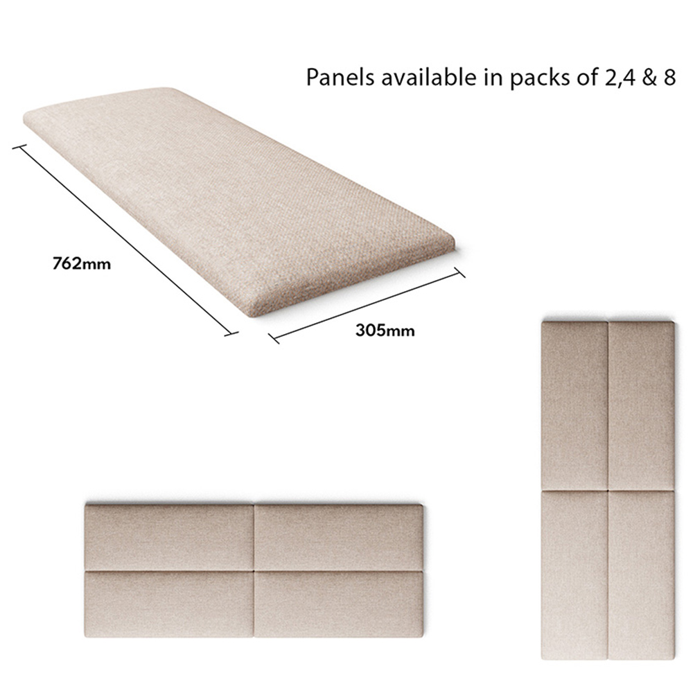 Introducing Aspire EasyMount Natural Saxon Twill Upholstered Wall-Mounted Headboard Panels. Transform your bedroom, living room, dining room, or office with these versatile wall panels. Effortlessly install them in minutes—simply peel and stick the pre-attached adhesive, a spirit level is recommended for a perfect finish. Mount them horizontally or vertically to create a stunning headboard or feature wall. Enjoy a comfortable feel thanks to the 35mm thick layer of luxurious foam padding. These panels offer a sturdy alternative to traditional headboards, eliminating the need for complicated assembly. Each panel is expertly handcrafted in the UK, ensuring superior quality. Individual panel dimensions: 762 x 305mm. Pack of four.