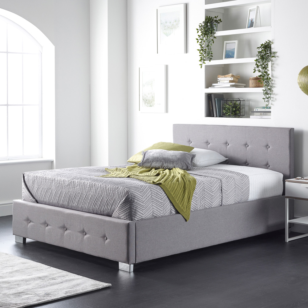 Aspire King Size Grey Plush Velvet Side Lift Ottoman Bed with Buttoned Headboard