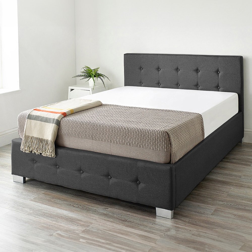 Stylish and practical, the Aspire Super King End Lift Ottoman Storage Bed in grey linen offers a comfortable sleep alongside ample storage space at an affordable price. Upholstered in high-quality linen fabric, this bed features a classic buttoned headboard and matching footboard, complemented by attractive silver feet.