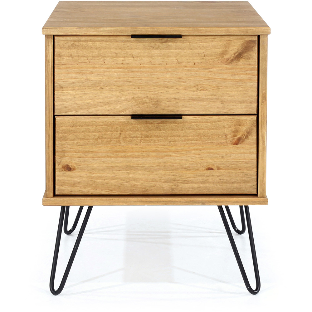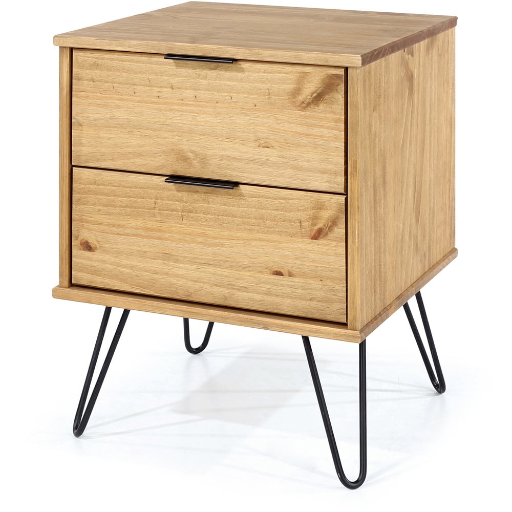 Upgrade your bedroom with the Augusta Pine Bedside Cabinet, a stylish blend of industrial design and practical storage. Crafted from real wood with an attractive antique wax finish, this cabinet boasts two convenient drawers for your essentials and features pull handles and metal hairpin legs. The ample tabletop provides space for your lamp, phone, or book.