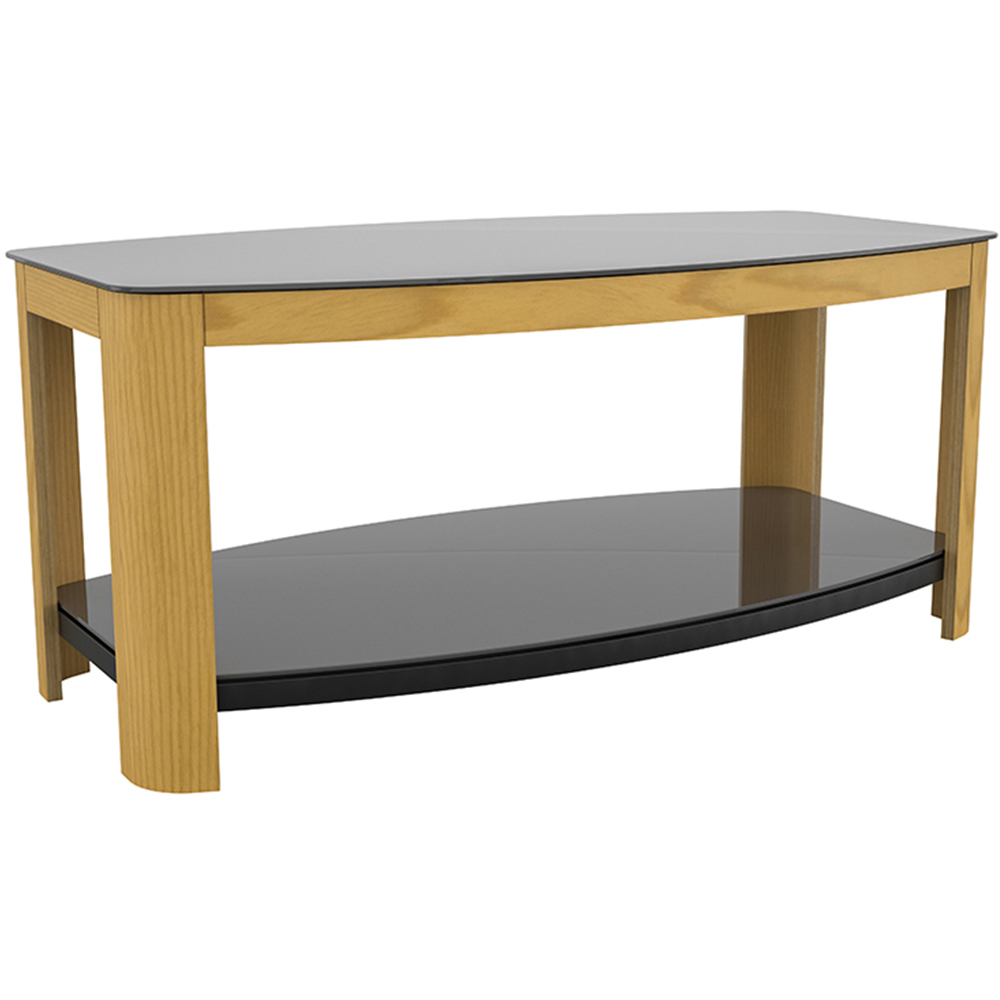 The AVF Affinity Oak Coffee Table: a stylish and practical addition to any home. Its simple yet elegant design, measuring 100cm wide, features curved real wood veneer and tempered black safety glass for a touch of modern sophistication. This versatile piece complements a variety of interior styles, equally at home as a statement piece or integrated into an existing scheme. Meticulously crafted, it seamlessly blends functionality with aesthetic appeal, elevating your living space with understated charm.
