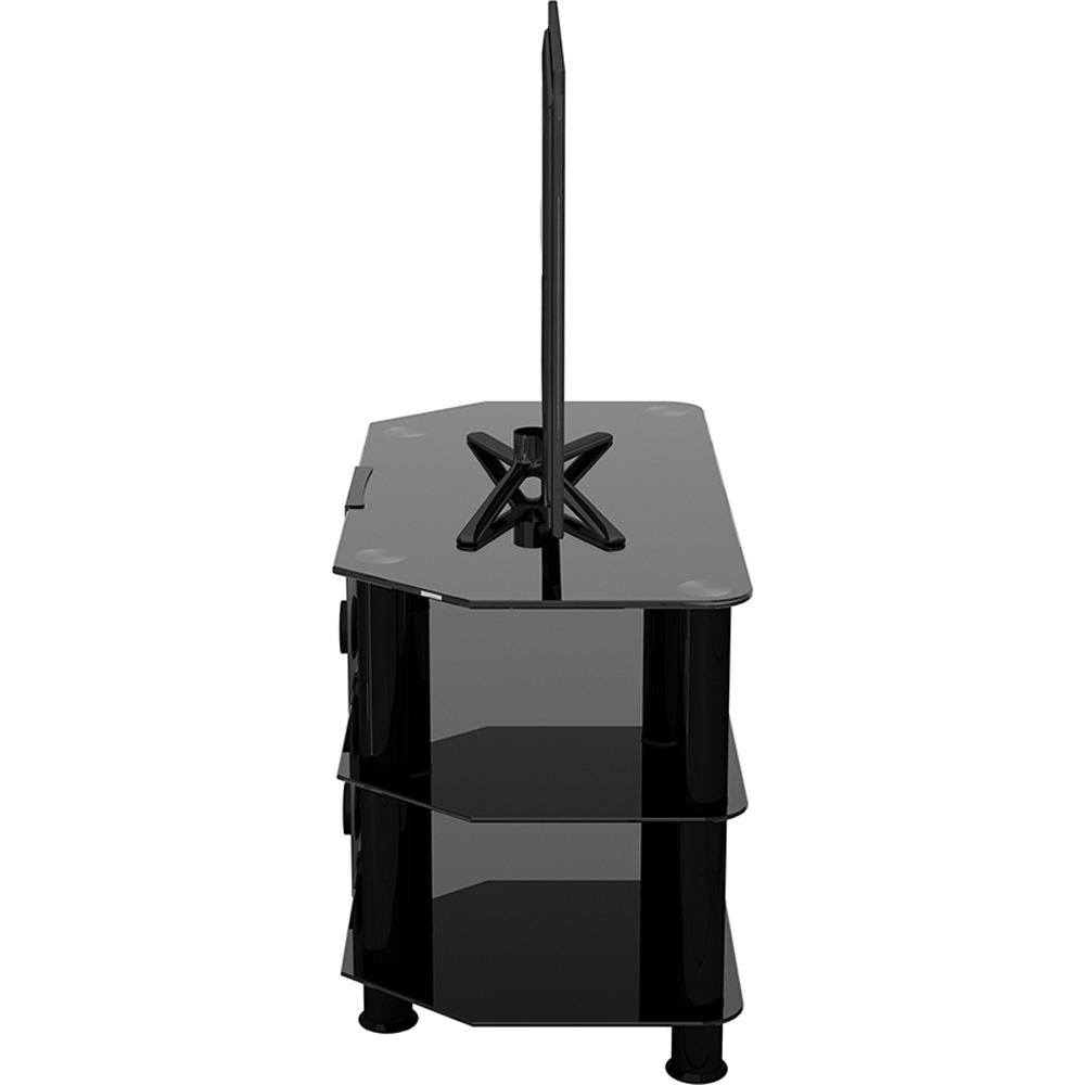 This contemporary TV stand offers a versatile solution for your home entertainment setup. Its sleek design, featuring black tempered safety glass and durable gloss black legs, adds a modern touch to any living space. The angled corners are cleverly designed to maximise space, making it perfect for corner placement. The stand boasts ample storage with a middle and bottom shelf, ideal for AV components. It comfortably supports TVs up to 42 inches and 40kg, while each of the lower shelves can hold up to 20kg. Integrated cable management, discreetly housed at the rear, keeps your wires neatly organised. Please note: The maximum TV size is a recommendation, check your TV's dimensions to ensure a proper fit before purchase, allowing for potential screen overhang.
