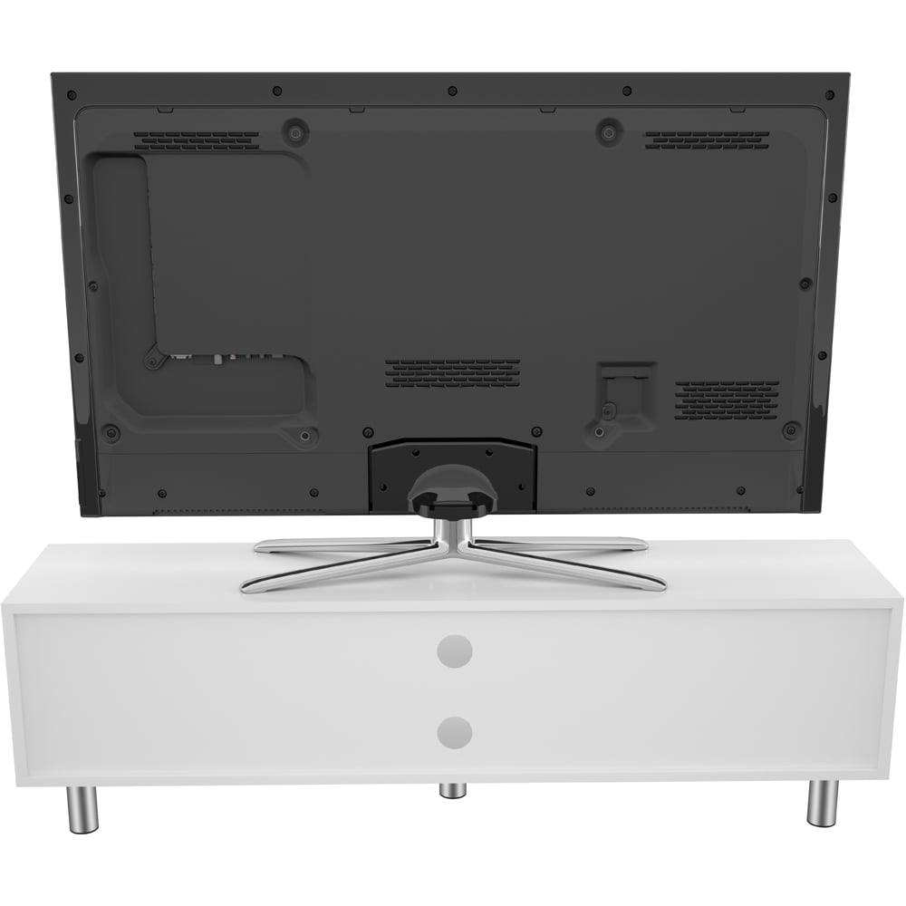 The Omaha: a striking TV unit where clean white lines meet the warm texture of a walnut finish. Standing proudly on five substantial legs, it's built to effortlessly support TVs up to 65 inches and 50kg. Keep your home cinema clutter-free with two discreet cabinets offering ample storage and cleverly concealed cable management within the central shelving.