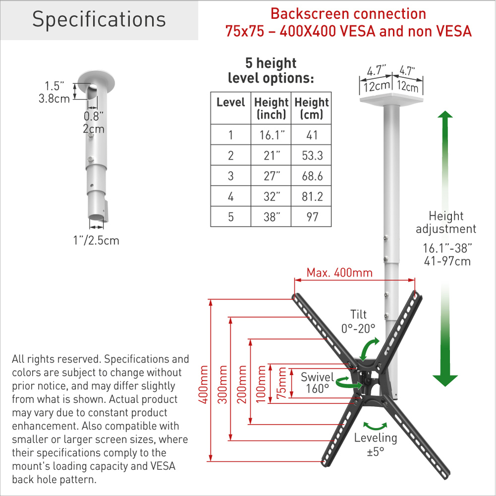 Maximize your viewing experience with the Barkan Multi-Position TV Wall Mount. This mount offers a space-saving solution for TVs from 13" to 65", supporting up to 40kg. Enjoy the perfect view with up to 25 degrees of tilt, ±5 degrees of screen levelling, and a 160-degree swivel. Five telescopic height settings, ranging from 12" to 38", provide customized placement. Its patented mechanism and positional adaptors accommodate various screen types and VESA patterns (100x100mm minimum, 400x400mm maximum). Integrated cable management keeps your wires neatly concealed.