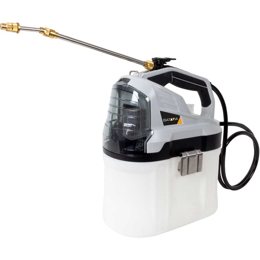 Effortlessly maintain your yard with the Batavia MAXXPACK BAT7064050 White Pressure Sprayer. Enjoy consistent 1.5 bar pressure without manual pumping for even application. Its 7.5-litre tank tackles larger areas with fewer refills. A comfortable shoulder strap distributes weight evenly, while the adjustable telescopic lance extends reach to hard-to-access spots. Ergonomic design allows for comfortable single-handed use. Features a 500ml/min flow rate. Note: Battery and charger sold separately.