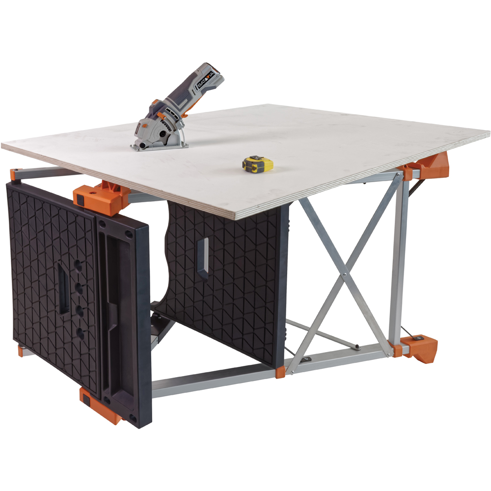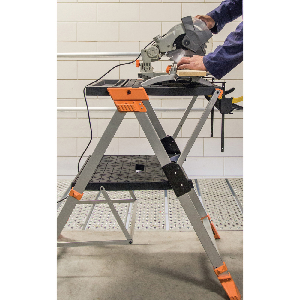 maximise your workspace efficiency with the Batavia Multifunctional Workbench and Step Ladder. This robust design delivers peak performance as both a workbench and a sturdy step ladder, boasting a very large standing surface for enhanced comfort and stability. As a step ladder, it includes a retractable safety bar and a handy tool tray. Further enhancing its versatility, it transforms into a stable support table when laid on its side, ideal for handling large sheets of material, wood, pipes, and more. Constructed from strong aluminium for easy storage, this versatile tool exemplifies a commitment to multi-functional usability. With a maximum load capacity of 150kg, it's built to handle demanding tasks.