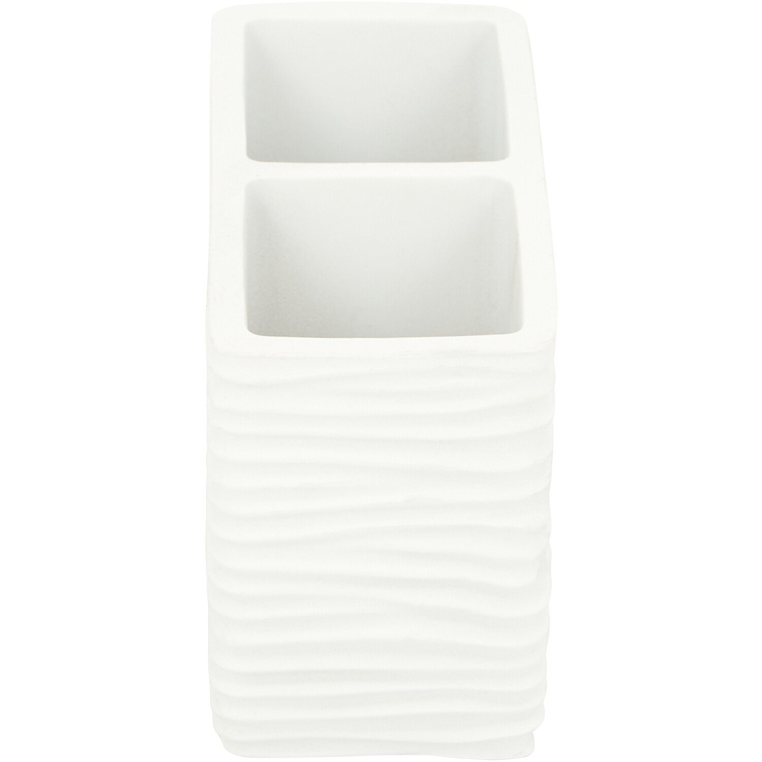 Elevate your bathroom's aesthetic with this Bali toothbrush holder. Its wavy, white surface adds subtle texture and complements existing décor. The design cleverly incorporates two separate sections for neat and hygienic toothbrush and toothpaste storage. Coordinate with other pieces for a unified bathroom look.