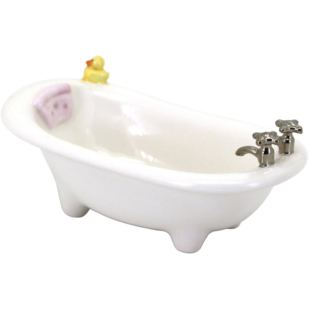 This charming bathtub-shaped soap dish adds a touch of playful elegance to your bathroom. Featuring delightful details like a headrest, rubber duck, and silver taps, it's a stylish addition to any décor. Designed to keep your sink area clean and free from soap residue, this practical soap dish helps prolong the life of your soap and prevents messy suds from accumulating on your countertop. A lovely way to keep your bathroom organised and looking its best.