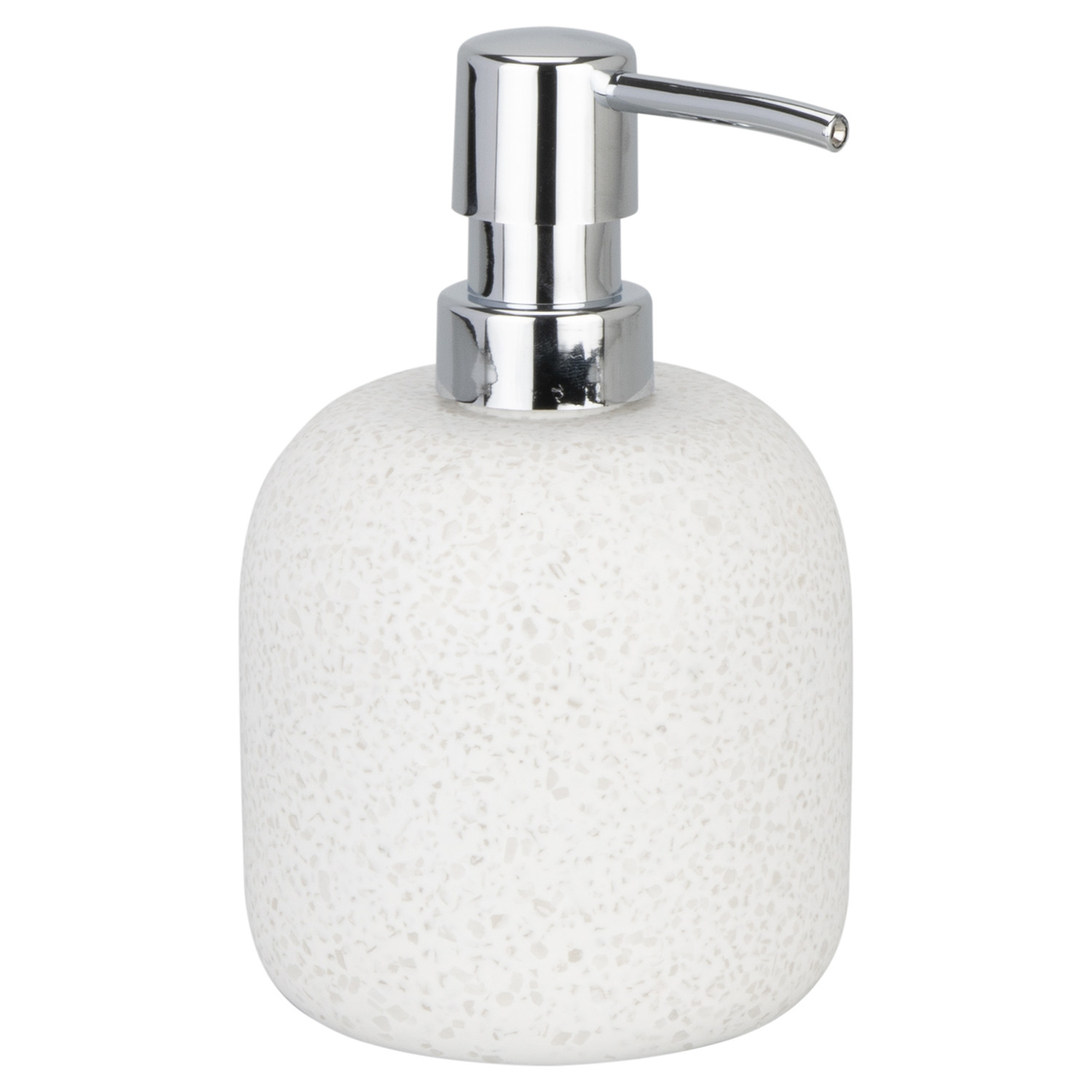 Elevate your bathroom's aesthetic with the Caliza soap dispenser. This stylish piece, crafted from speckled stone in your choice of white or pink, features smooth curves and a gleaming chrome nozzle. A perfect addition to any modern bathroom, it effortlessly holds hand soap or lotion, allowing you to maintain a cohesive and sophisticated look by dispensing from a single, elegant vessel.