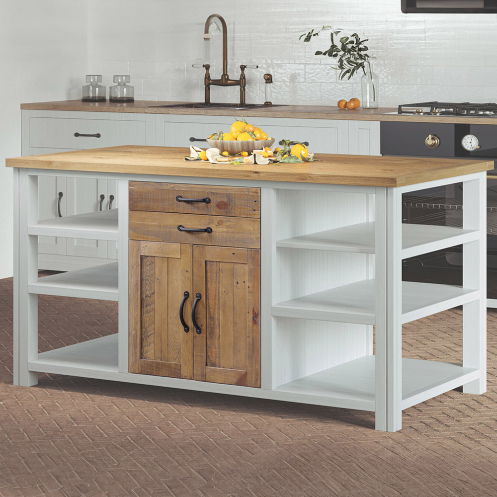 Transform your kitchen with the Baumhaus Splash of White Kitchen Island. This freestanding island effortlessly blends functionality and style, perfect for neutral kitchens. Ample storage is provided by two drawers on each side, a spacious double-doored cupboard (each side), and six open shelves. The reclaimed wood, protected by a durable clear lacquer, showcases its unique character and grain. Steel accent handles and a crisp white finish add timeless elegance. Delivered fully assembled with a five-year guarantee. Dimensions: H80cm W150cm D74cm. Crafted from environmentally friendly reclaimed wood. Drawer dimensions: H10cm W60cm D35cm. Cupboard dimensions: H52cm W60cm D80cm (with a central shelf). Bottom open shelf dimensions: H30cm W68cm D40cm. Middle and upper open shelf dimensions: H22cm W68cm D40cm.