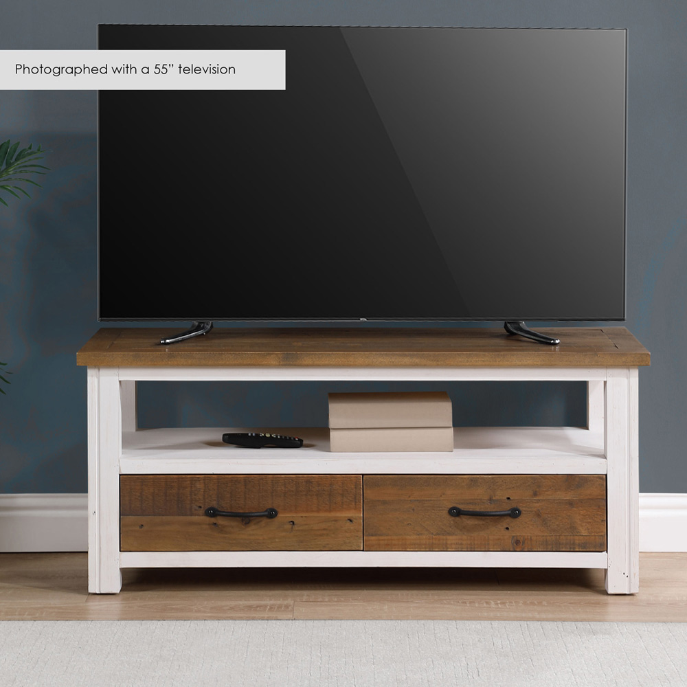 Make a statement with the Splash of White TV cabinet. This stylish unit effortlessly blends modern design with the rustic charm of reclaimed weathered wood. Designed to comfortably hold a 50-inch television, it boasts two drawers with steel handles for discreet storage and a handy open shelf for your media essentials. The striking contrast between the hand-sprayed white finish and the natural wood grain creates a truly unique piece. A protective lacquer highlights the wood's character, preserving its inherent imperfections. This beautifully crafted cabinet arrives fully assembled and includes a reassuring five-year manufacturer's guarantee. Dimensions: H47cm W110cm D45cm. Drawer dimensions: H20cm W45cm D40cm.