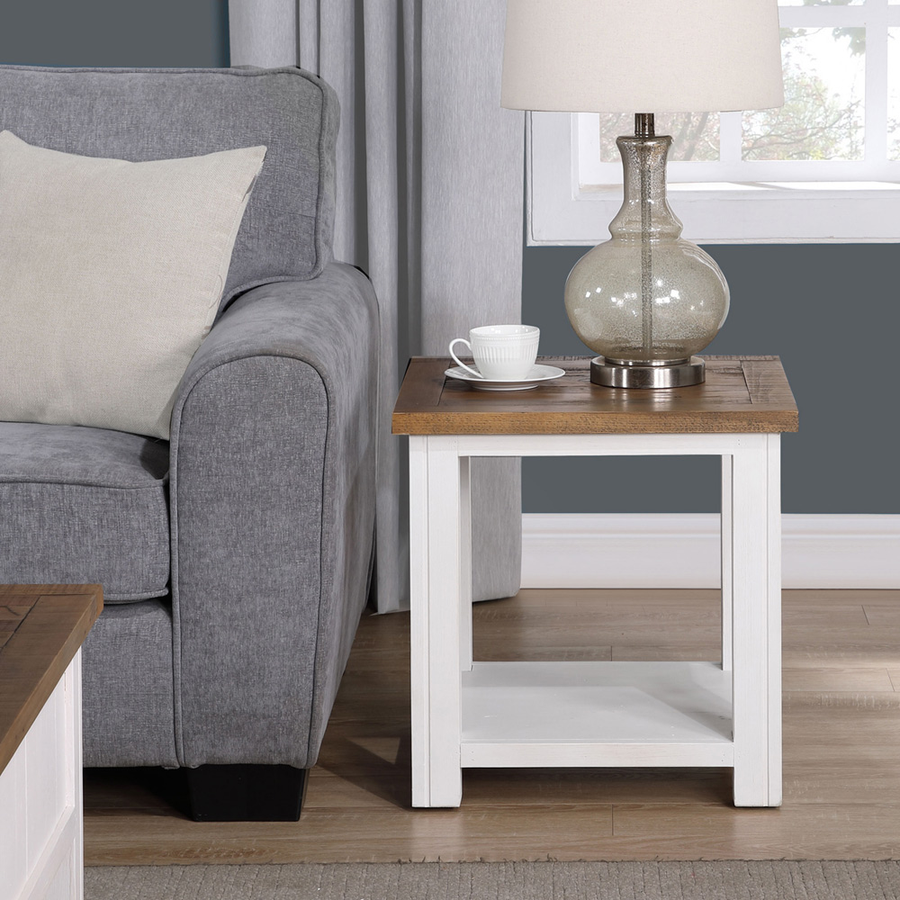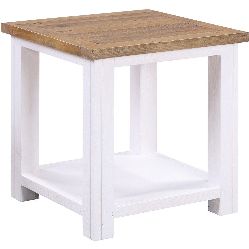 This stylish lamp table, in a brown and white finish, adds a touch of modern rustic charm to any room. Crafted from reclaimed weathered wood, its clean lines and unique grain markings are showcased by a durable clear lacquer finish. A handy shelf provides convenient storage, helping to keep your space clutter-free. Delivered fully assembled with a five-year guarantee, this versatile piece measures 50cm H x 50cm W x 50cm D. The subtle colour variations inherent in the reclaimed wood add to its character and appeal.