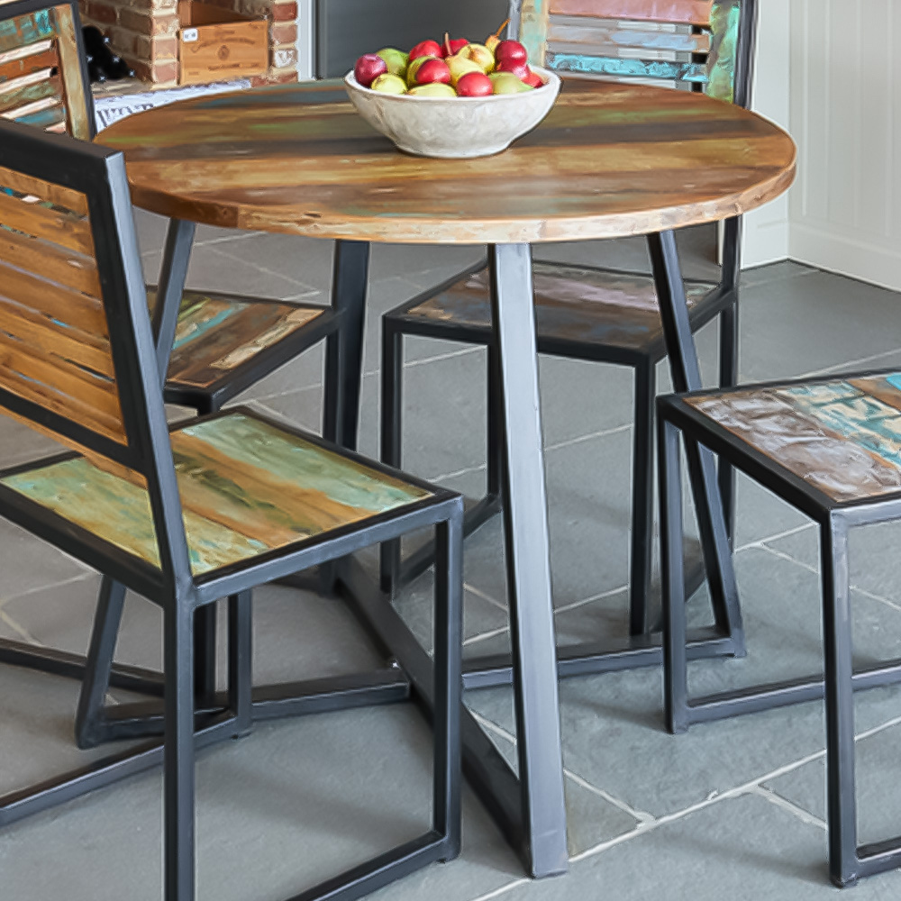 Effortlessly stylish and uniquely yours, the Baumhaus Urban Chic 4-seater round dining table will transform your dining space. This vibrant 100cm table boasts a timeless design, crafted from reclaimed wood sourced from Gujarat, Maharashtra, and Rajasthan in Southern India – some pieces dating back up to 150 years! Hand-finished by skilled artisans, each table is truly one-of-a-kind. A robust steel frame ensures stability, while a protective satin lacquer showcases the rich wood grain and delivers a glossy, enduring finish. A perfect piece for intimate gatherings and family meals alike.
