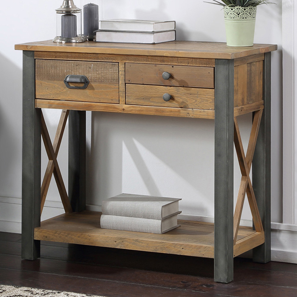 Elevate your living space with the Baumhaus Urban Elegance console table. This stunning piece boasts a spacious shelf and three handy drawers, offering ample storage. The combination of a distressed, powder-coated steel frame – finished in an attractive matt finish – and solid reclaimed rough-sawn wood creates a unique blend of rustic charm and industrial chic. Perfect for any home, its versatile design effortlessly softens a modern interior. Dimensions: 79 x 38 x 85cm.