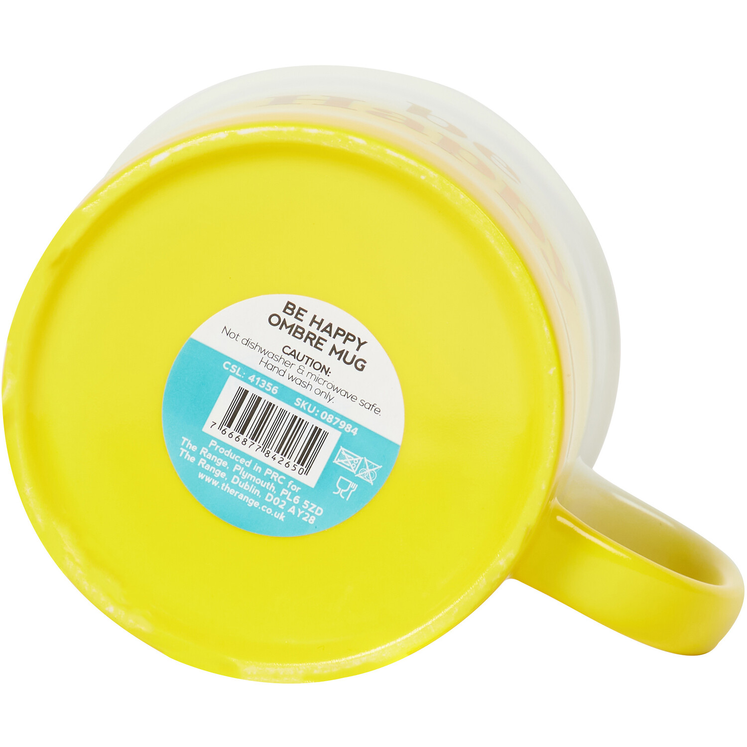 A vibrant addition to any kitchen, the Be Happy Ombre Mug boasts a cheerful yellow ombre design finished with the words "be happy" in gold foiling. Perfect for elevating your morning routine, this mug also makes a thoughtful gift.