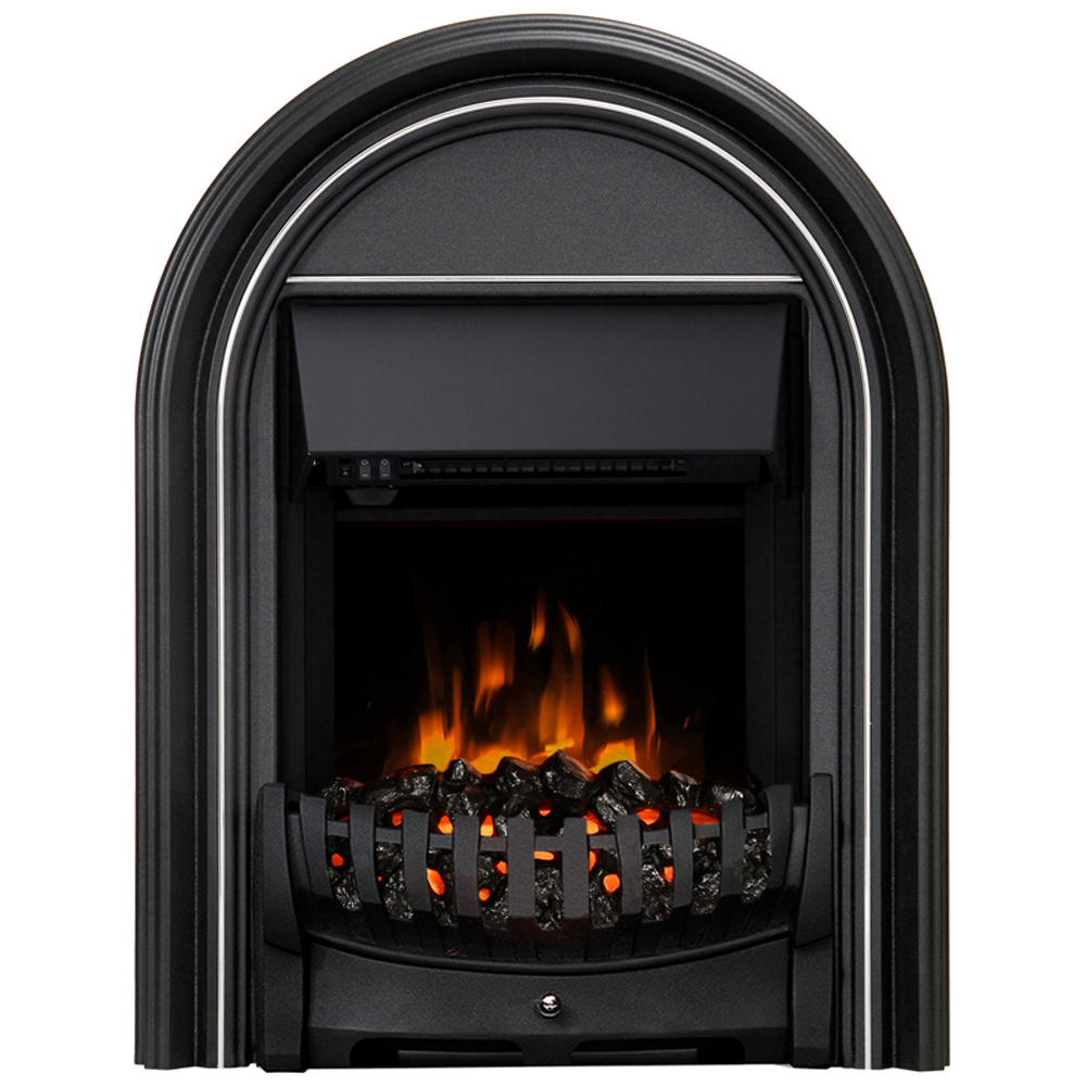 Showcasing an arched design accented with chrome detailing and a glowing coal bed, the 16" Abbey Electric Inset Fire brings traditional charm to any room. Finished in sleek black, this fire emulates the look of a classic cast iron fire and is compatible with any standard fireplace surround. The LED flame effect creates a mesmerising focal point, making the Abbey a distinctive centrepiece to complement any interior style.