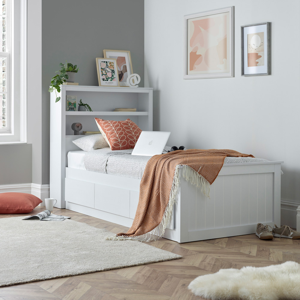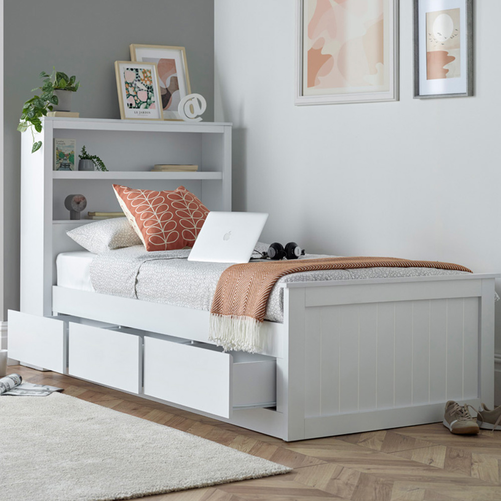 Elevate your bedroom with the Enzo single bed frame, a stylish and practical addition to any space. This cleverly designed frame boasts a minimalist aesthetic, featuring a pristine white finish and an elegant headboard incorporating two handy bookshelves – perfect for bedtime reading or decorative accents. Three generously sized drawers, seamlessly integrated into the frame, offer ample storage for bedding, clothes, or other essentials. Crafted from high-quality rubberwood with a robust slatted base, the Enzo ensures both durability and comfort. The frame is complemented by a single-size Theo pocket sprung mattress, promising a restful night's sleep. Drawers can be assembled on either side for ultimate convenience, and detailed instructions ensure straightforward self-assembly. Internal drawer dimensions are 14 x 53 x 33.5cm, and the footboard stands at a height of 55.5cm. Delivery is to your chosen room.