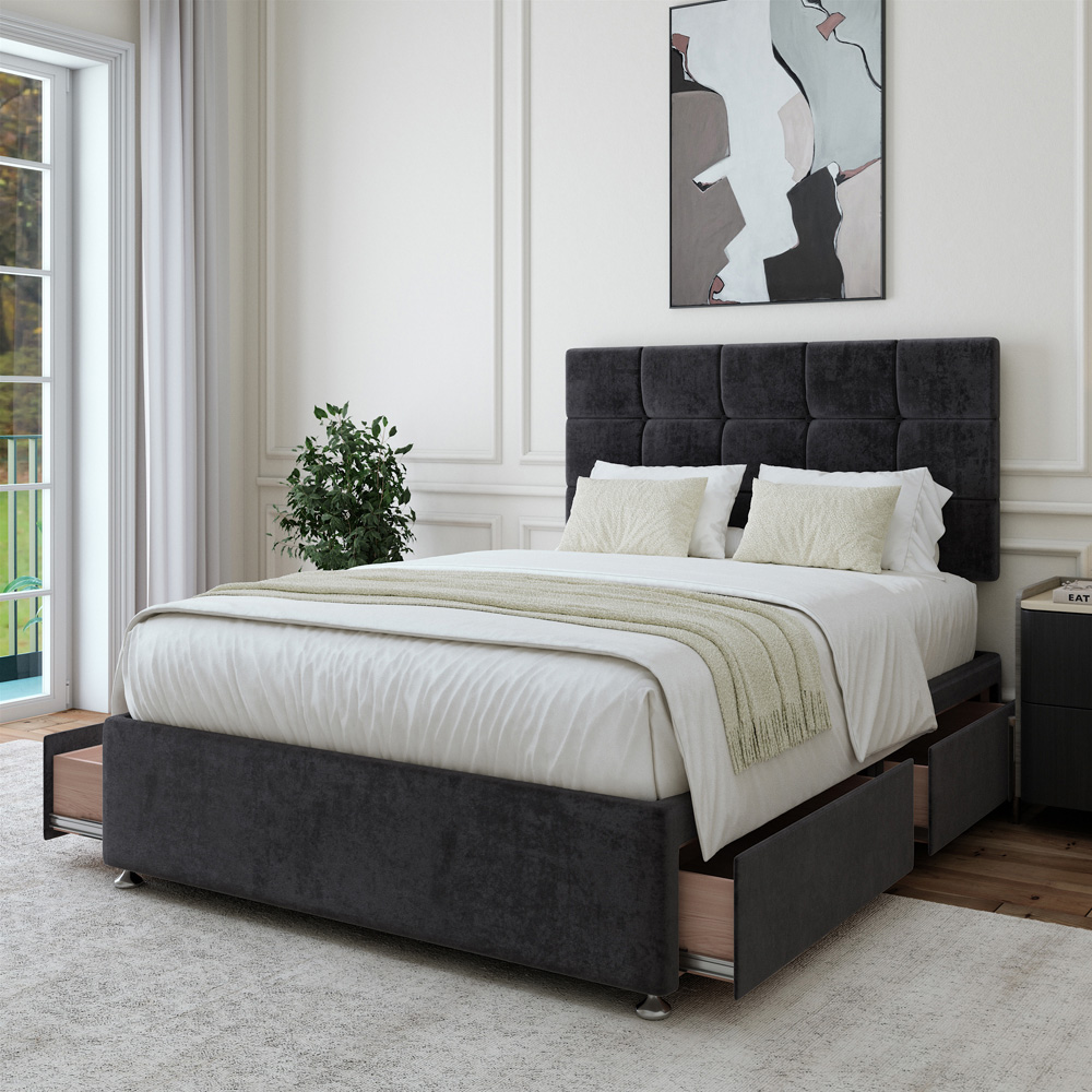 Upgrade your bedroom with this solid divan base and headboard, crafted by a leading UK manufacturer. Providing steadfast support for your mattress, it boasts a sturdy platform top and is finished with stylish chrome fittings and smooth-gliding feet. Enjoy the flexibility of a universal design; position the headboard and any storage to either side, as you prefer. Choose from a range of colours and fabrics, and select your storage option: 0, 2, or 4 drawers.
