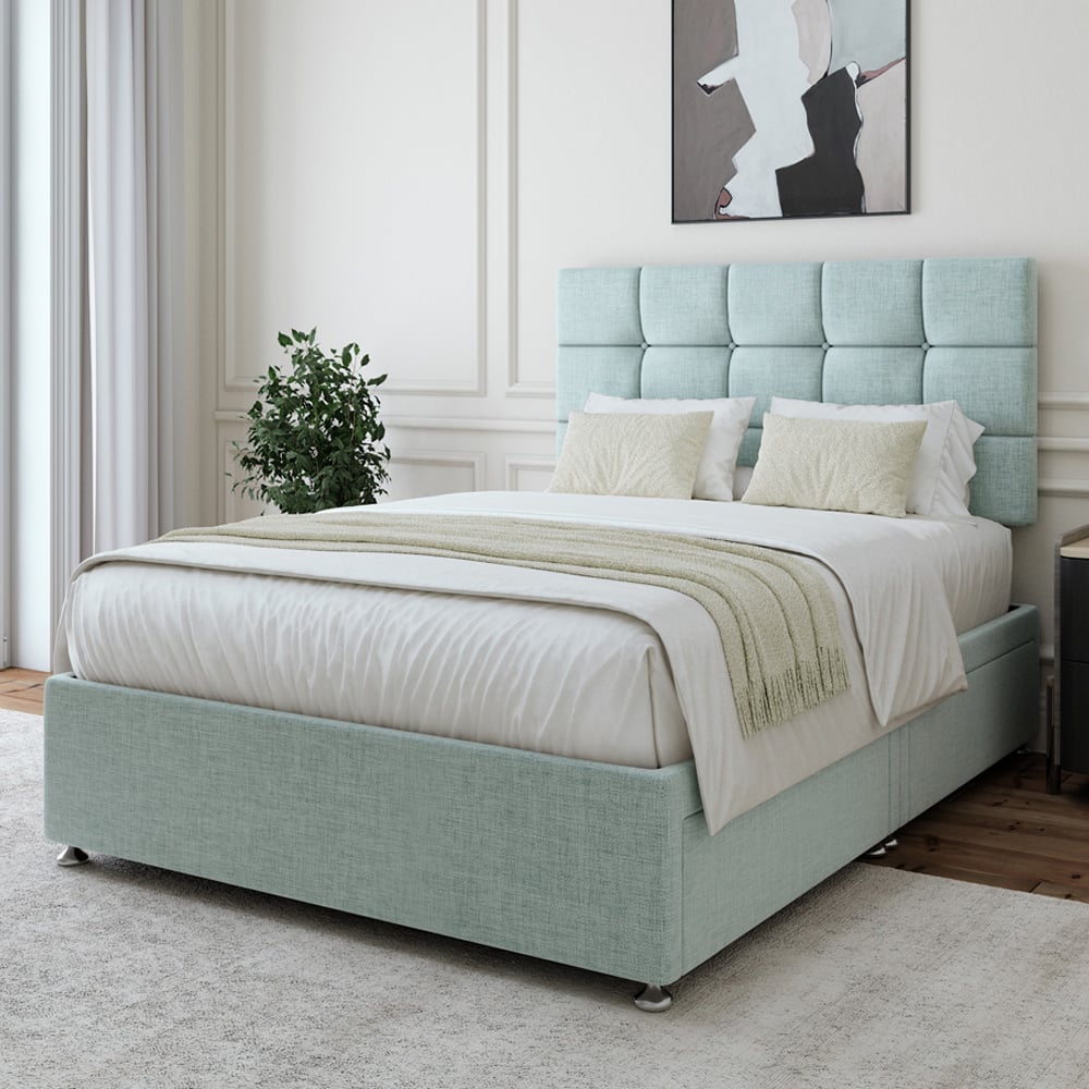 Bedmaster King Size Duck Egg Linen 4 Drawer Divan Base with Pearl Headboard