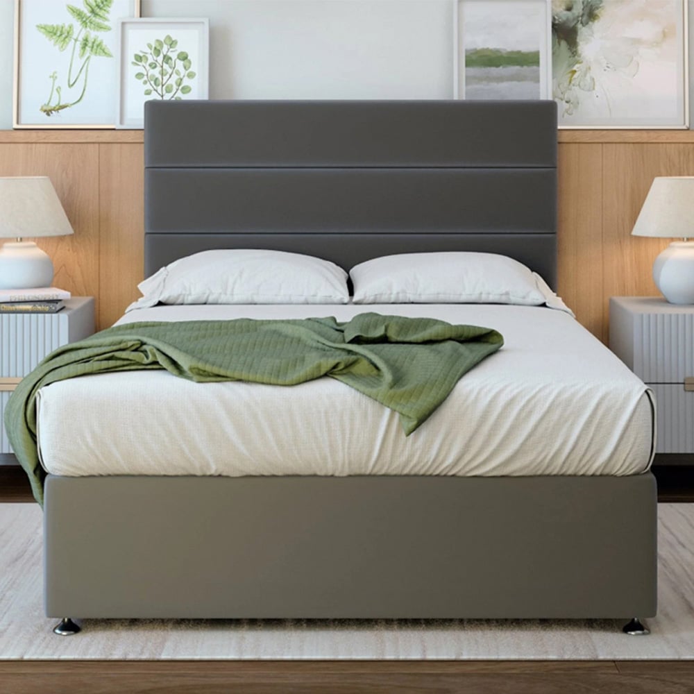 Enhance your bedroom with this robust divan base and headboard, crafted by a leading UK manufacturer. Its solid platform provides a firm and supportive foundation for your mattress, complemented by stylish chrome fittings and smooth-gliding feet. Enjoy the versatility of a universal design; position the headboard and any storage to suit your preference. Choose from a range of fabrics and colours, and select a base with 0, 2, or 4 drawers to perfectly match your needs.