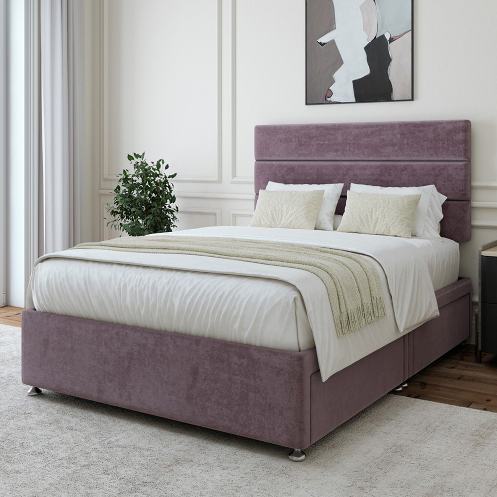 Upgrade your bedroom with this robust divan base and headboard, crafted by a leading UK manufacturer. Providing a firm and supportive foundation for your mattress, it's finished with stylish chrome fittings and smooth-gliding feet. Enjoy the versatility of a universal design; the headboard and any storage options can be positioned on either side. Choose from a range of colours and fabrics, and select your preferred storage configuration: 0, 2, or 4 drawers.