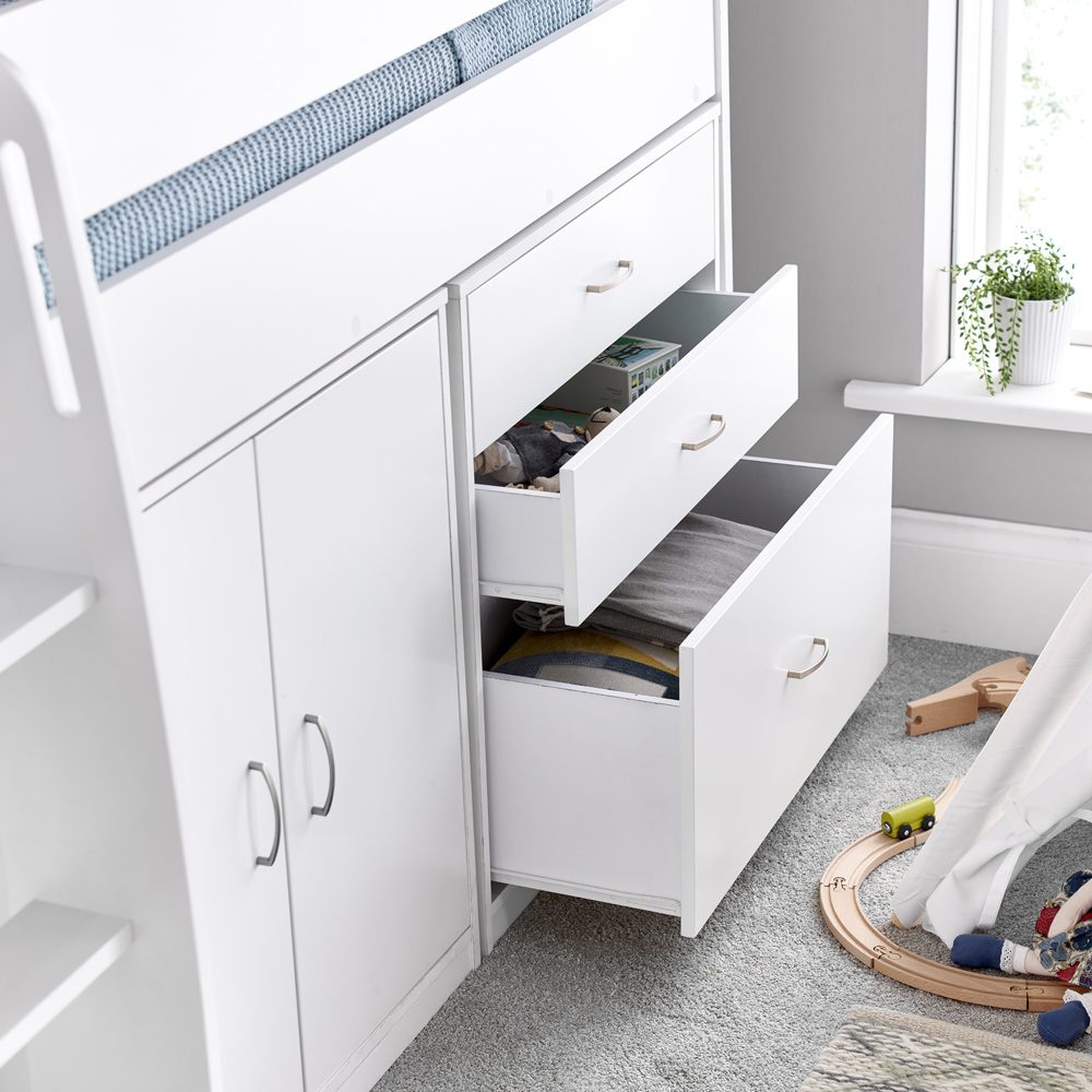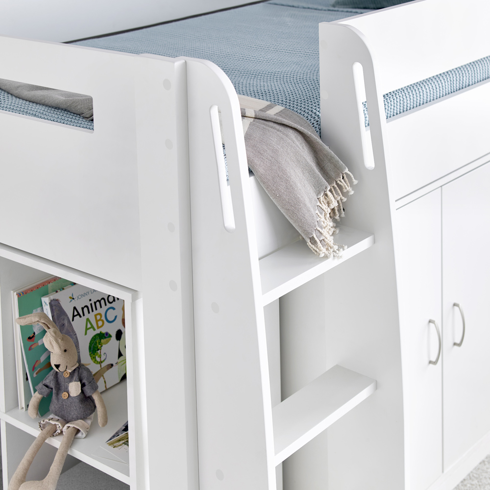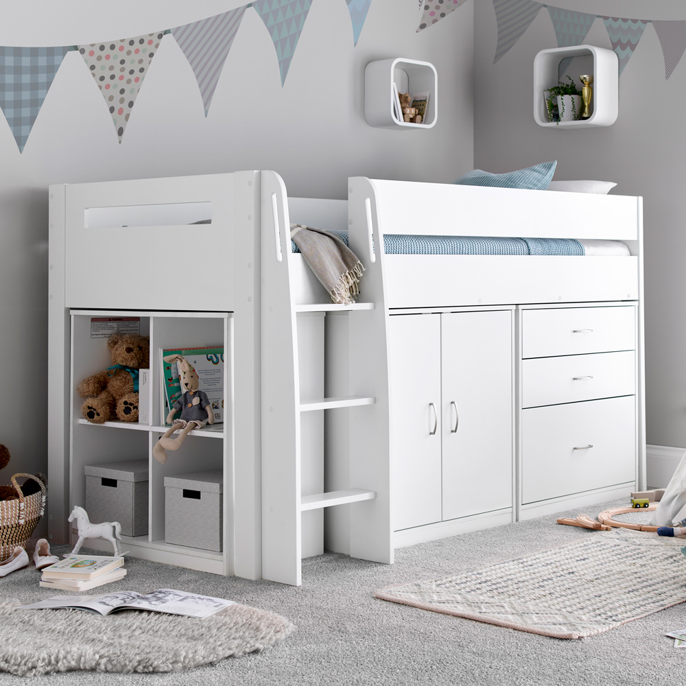 The Bedmaster Lacy White Storage Mid Sleeper with Pocket Sprung Mattress offers a complete comfort package with ample storage. Featuring a contemporary design and versatile white finish, this bed is a fantastic addition to any bedroom, whether it's a vibrant kid's room or a more mature teenager's haven. Combining modern aesthetics with timeless appeal, it's ideal for updating and elevating bedroom decor.
