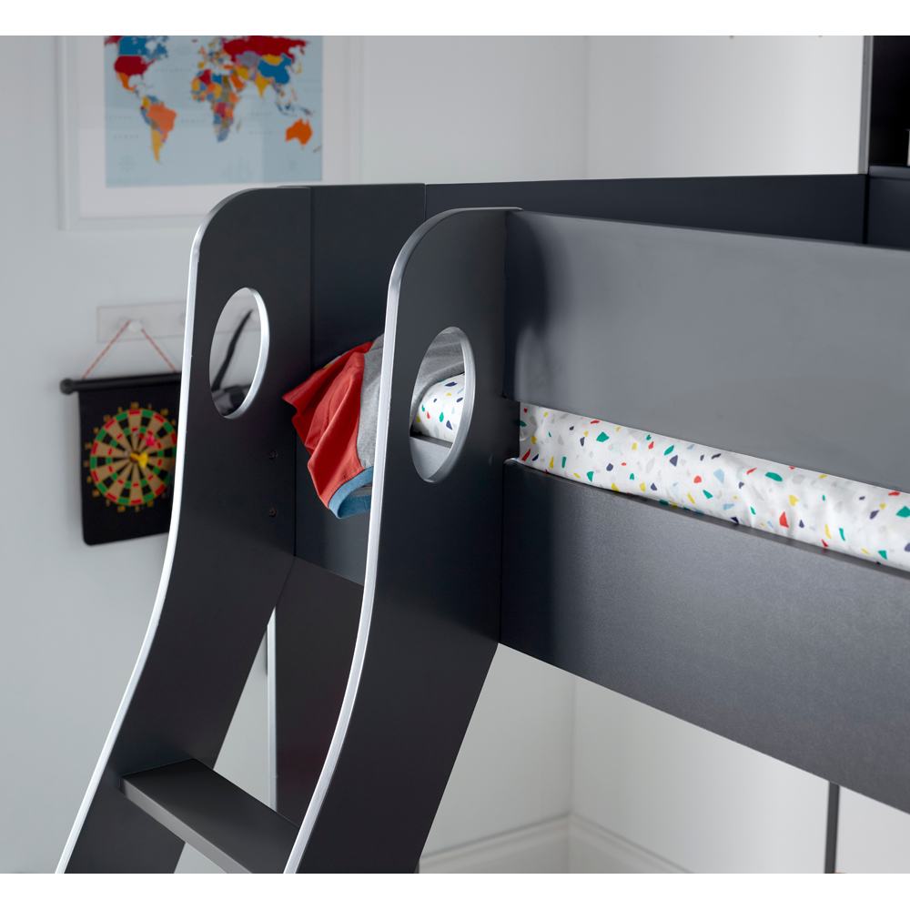 Upgrade your children's bedroom with the stylish and practical Oliver Onyx Grey Triple Sleeper Bunk Bed. This contemporary bunk bed features a unique design, with both top and bottom tiers equipped with shelves and dividers – perfect for storing books, toys and essentials. For added safety, the sturdy ladder is positioned close to the frame and features cut-out handles. The lower bunk sits near the ground, enhancing safety and creating a more spacious feel in the room. Crafted from solid Rubberwood and finished in a chic onyx grey, this bunk bed offers durability and adds a touch of elegance to any décor. It comes complete with two Bedmaster Theo Pocket Sprung mattresses, ensuring a comfortable night's sleep. Ideal for any home, this bunk bed is supplied flat-packed and requires self-assembly.
