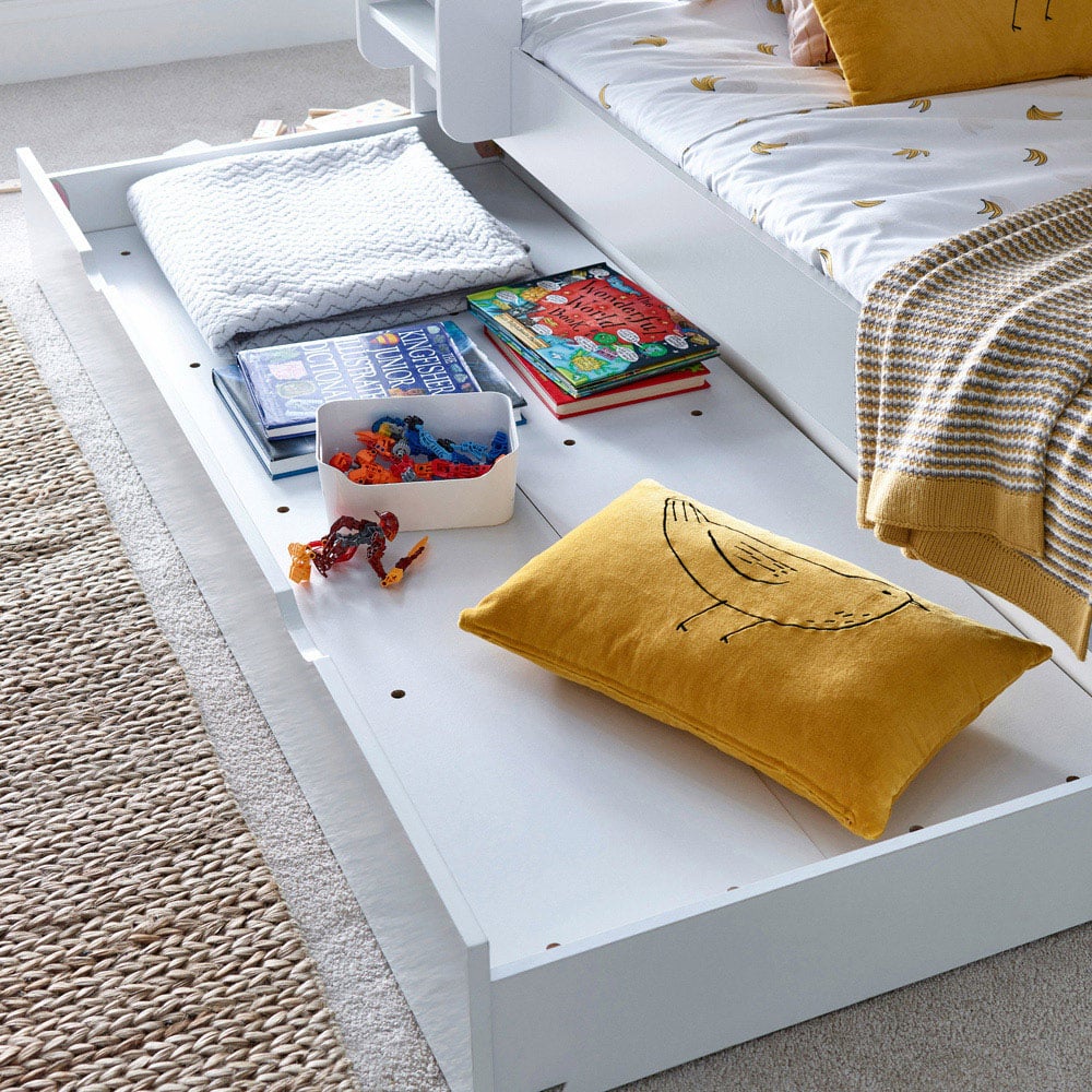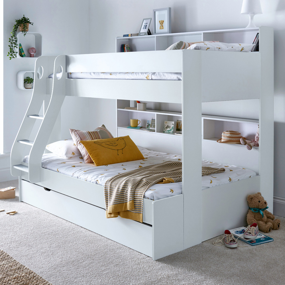 Give your child's bedroom a stylish upgrade with the Oliver White Triple Sleeper Bunk Bed. Boasting a modern design, this bunk bed features a single top bunk and a roomy small double bottom bunk, each with convenient shelves and dividers for keeping books, toys and other essentials tidy. Built from durable solid Rubberwood, it also offers the option of a pull-out storage drawer for added practicality. With an adaptable design, including a ladder that can be positioned on either side, this bunk bed is a perfect fit for any room decor.