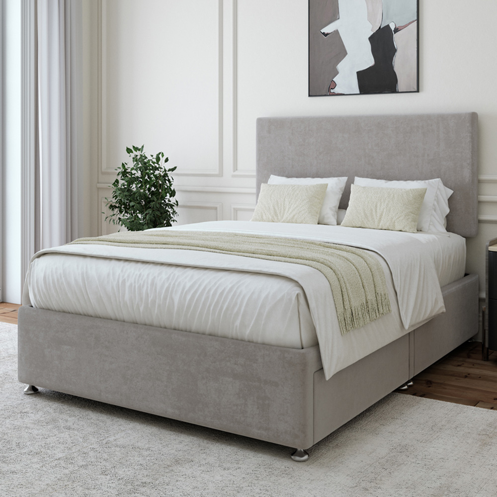 Elevate your bedroom with this robust divan base, crafted by a leading UK manufacturer. Its solid platform top provides excellent mattress support, while chrome fittings and gliders ensure smooth movement and a premium finish. Enjoy the versatility of a universal design – the headboard fits either side. Choose your perfect look with options for 0, 2, or 4 drawers and a wide selection of fabrics and colours.