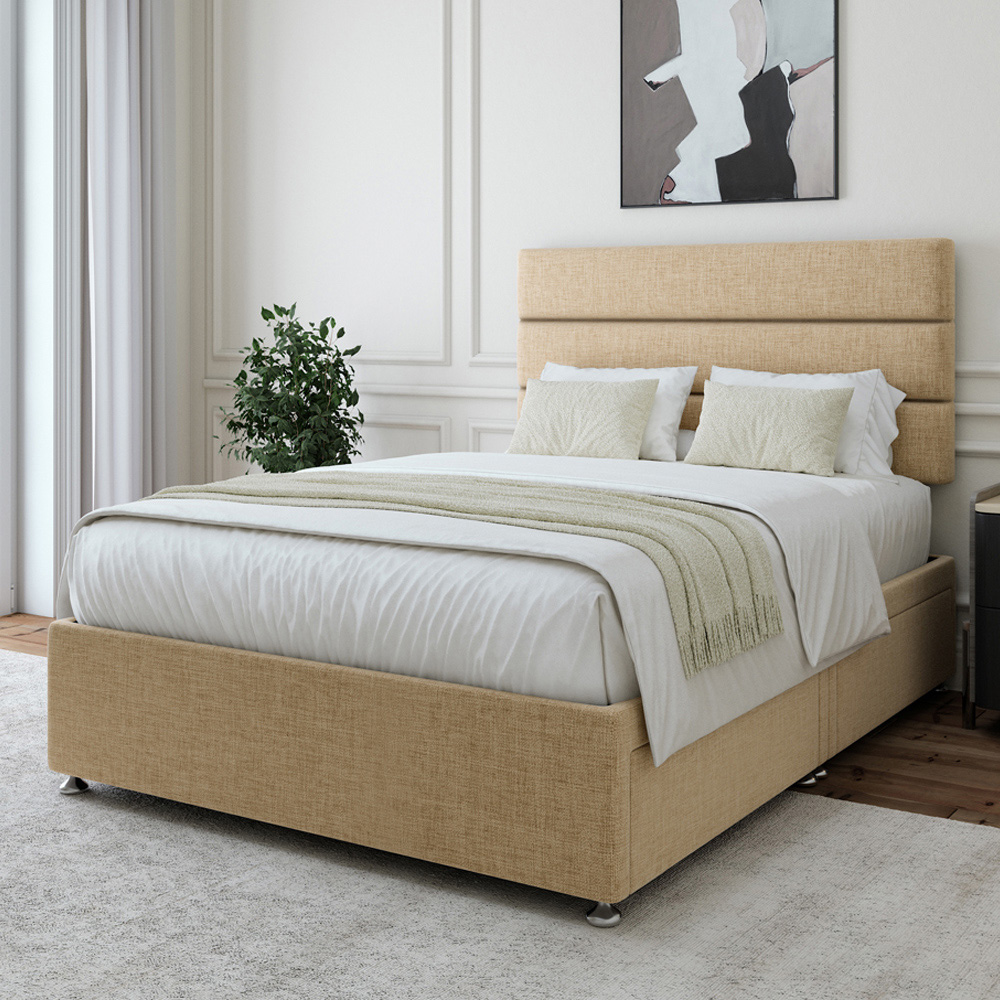 Experience unparalleled comfort and support with this solid platform top base and headboard. This divan provides support and a firm foundation for your mattress. It is finished with chrome fittings and gliders. This divan is universal meaning the headboard and storage can be placed on any side.