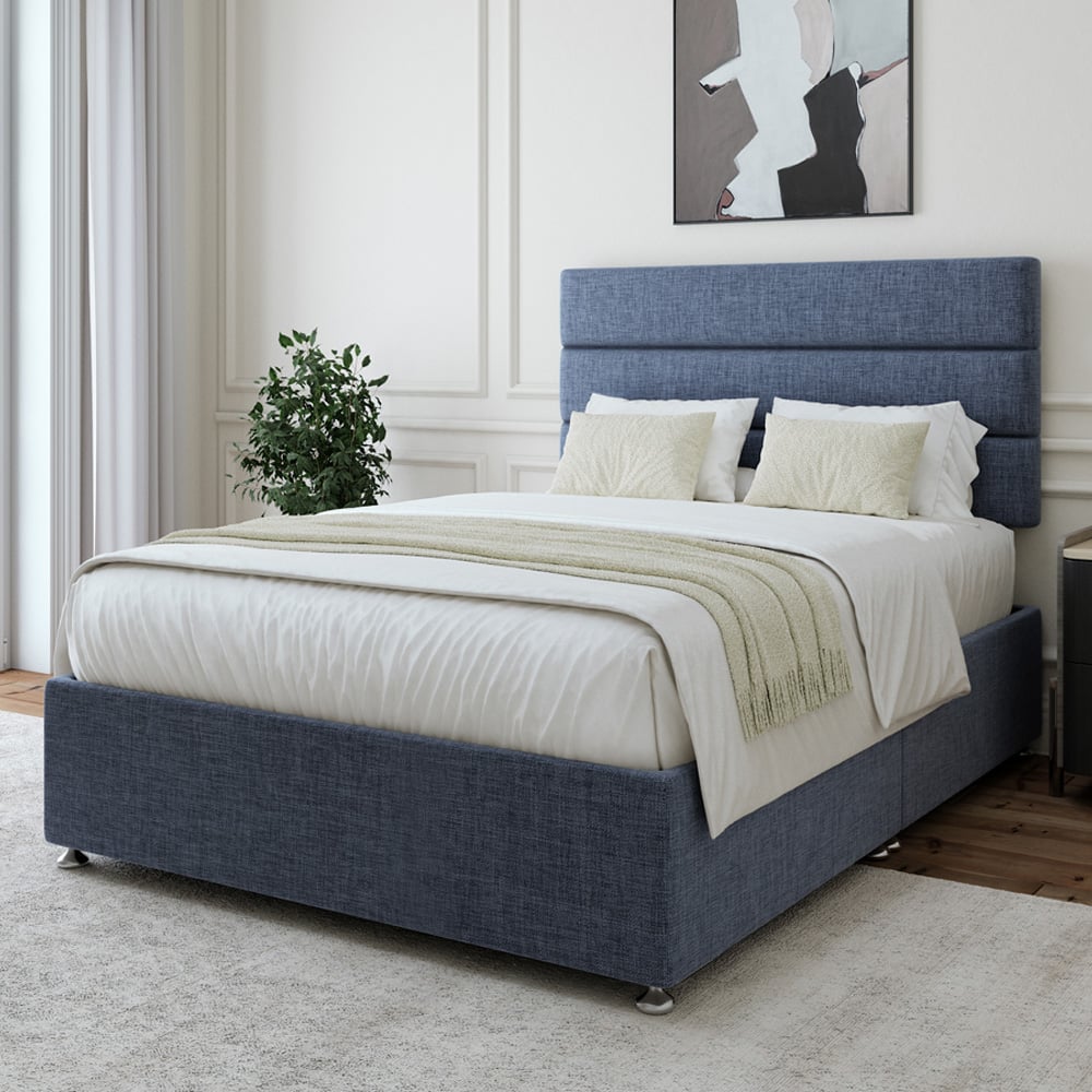 A solid platform top base from one of the UK's leading manufacturers. Providing support and a firm foundation for your mattress. Finished with chrome fittings and gliders. This divan is universal meaning the headboard and storage can be placed on any side. Can be purchased with headboard and with 0, 2 or 4 drawers. Available in an array of fabrics and colours. Please note: Headboard is not include.