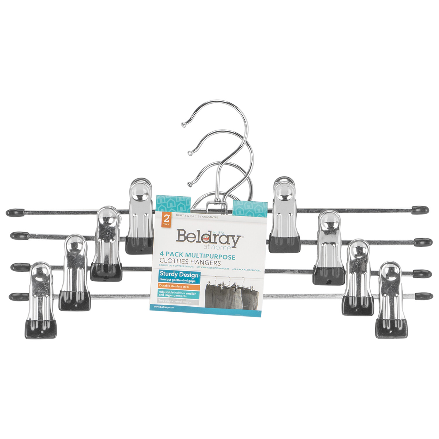 Maximise your wardrobe space with this brilliant Beldray Trouser or Skirt Hanger set. Featuring non-slip hooks and strong grips, these hangers are ideal for keeping trousers, skirts, and a variety of other garments neatly organised. Crafted from strong metal, this pack of four ensures you have ample storage solutions for all your needs. The adjustable grips span the hanger's length, accommodating various sizes and preventing unwanted stretching or damage to your garments.