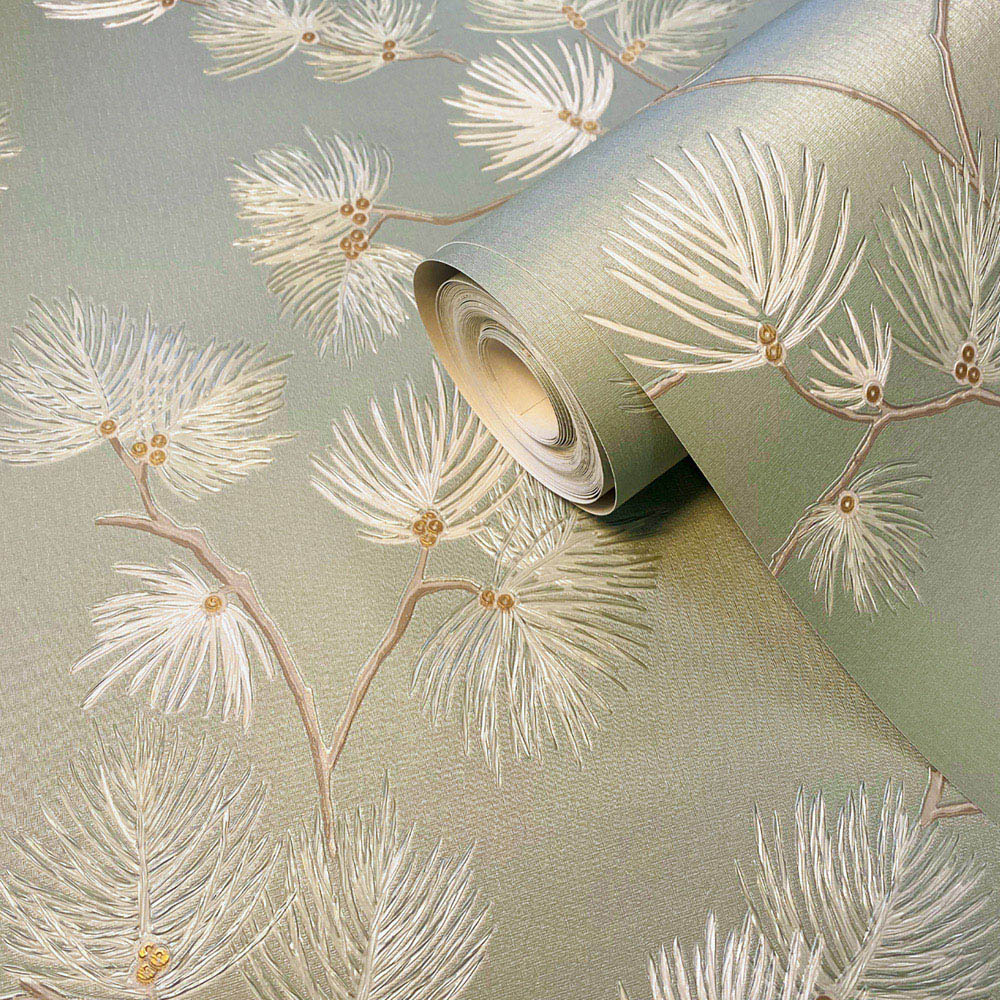 Indulge your walls with this exquisite Italian wallcovering collection, boasting a show home colour palette. The timeless, textured design evokes the richness of fabric, subtly shimmering with delicately placed sequins. Imagine the captivating light reflection as each classic pine leaf motif, featuring a tiny sequinned centre, rests against a luxurious satin backdrop. Available in mocha, champagne, and a soft sage, these designs beautifully coordinate with other textures in the range, creating a truly stunning interior.