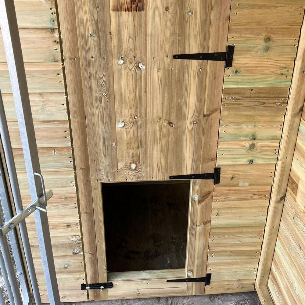 This robust dog kennel offers a safe and comfortable haven for your canine companion. Constructed from durable, pressure-treated 45 x 45mm tanalised timber, its framework ensures lasting strength. The 12mm thick tanalised tongue and groove shiplap cladding provides a weather-resistant exterior, while the OSB 3 roof offers structural integrity. A perfect blend of practicality and sturdiness for years of reliable service.