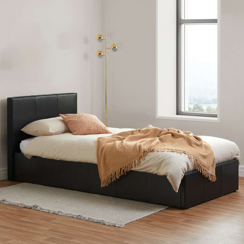 Indulge in ultimate comfort with the Berlin Single Ottoman Bed, a stylish addition to any bedroom. Its contemporary design boasts luxurious faux leather upholstery and dark wooden feet, creating a sophisticated look. The sprung slatted base provides natural bounce and adapts to your pressure points for exceptional comfort. This bed is designed for a UK standard single mattress, with a recommended maximum height of 250mm. The maximum weight capacity is 150kg.