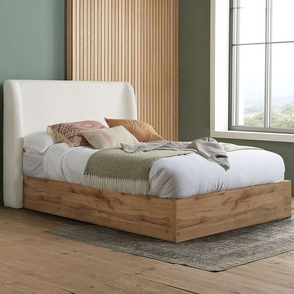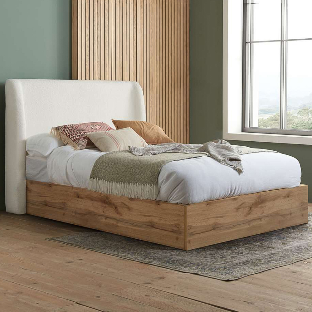 The Halfden king-size ottoman bed frame, a stylish addition to any bedroom, blends modern elegance with practicality. Its luxurious, soft-touch boucle© headboard complements its robust wooden structure. The sprung slatted base naturally conforms to your body, enhancing comfort. Offering ample under-bed storage, easily accessed via a hydraulic lift mechanism, this frame provides a neat storage solution. The Halfden supports a maximum weight of 150kg.