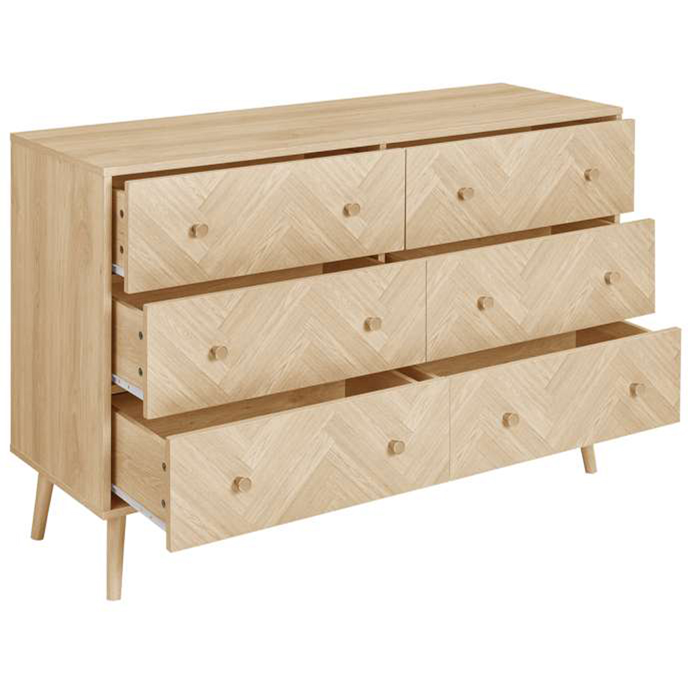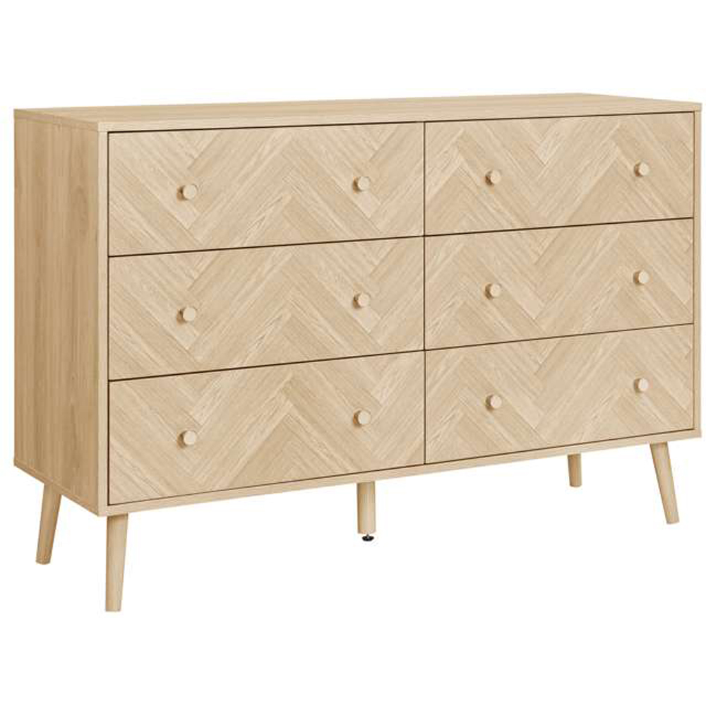 Elevate your bedroom's aesthetic with the Birlea Herringford 6 Drawer Oak Chest. This magnificent piece offers ample storage, cleverly divided across six drawers to accommodate everything from delicate items to bulkier items like clothing and bedding. Crafted from high-quality particleboard and finished with a stunning oak effect laminate, it captures the warmth and visual appeal of real wood. Inspired by the symmetry and precision of classic chevron patterns, it adds a touch of architectural finesse to any bedroom setting.