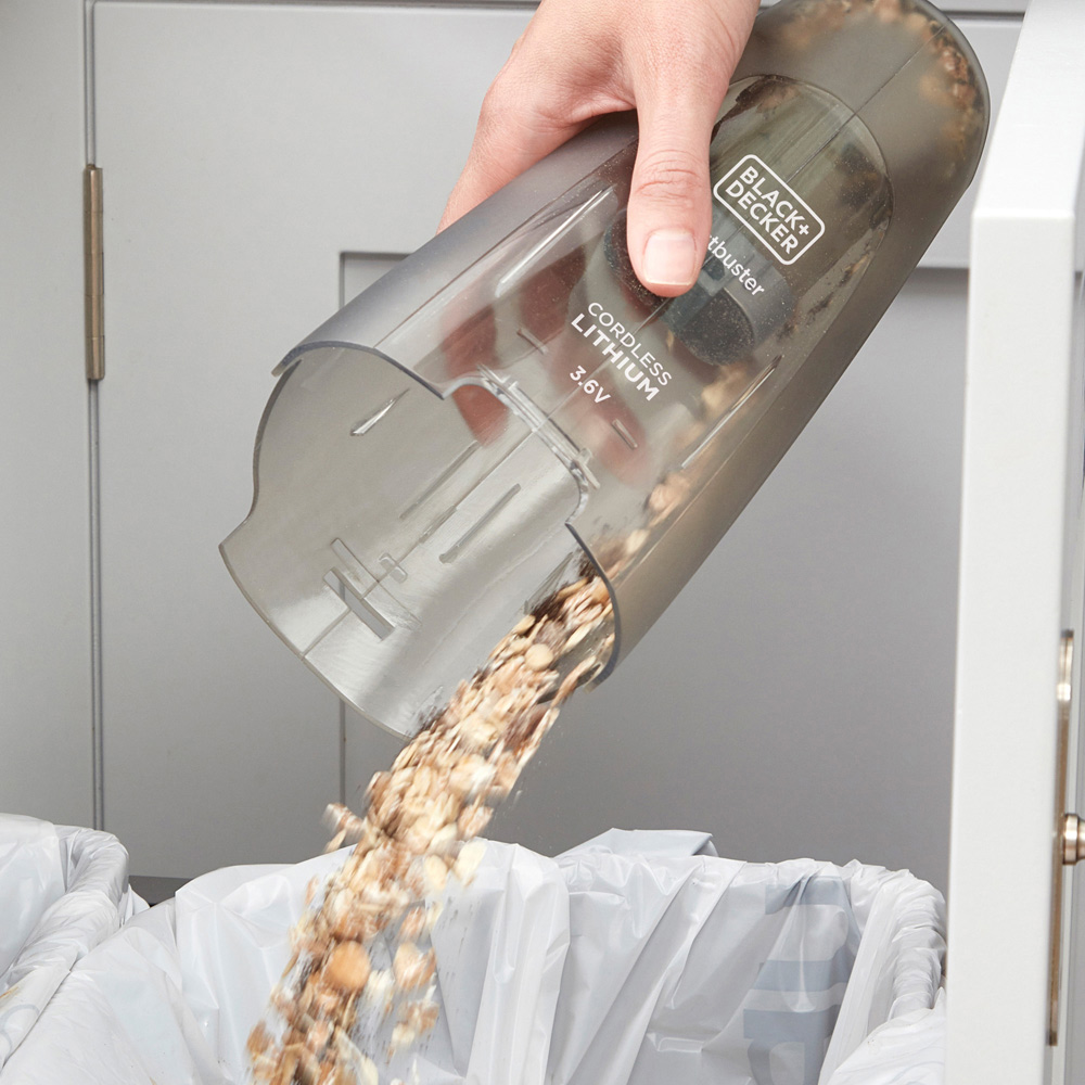 Effortlessly tackle everyday cleaning tasks around your home, garage, or car with this cordless Black + Decker Dustbuster. Its 3.6V lithium-ion battery provides the freedom of cordless cleaning, while the lightweight and compact design makes cleaning awkward spaces a breeze. The wide mouth easily picks up larger debris like cereal or pet food, and the 325ml removable and washable bowl allows for convenient emptying – you'll always know when it's full thanks to the translucent plastic. The innovative design enables hands-free bowl emptying directly into the bin. Includes a jack plug charger.