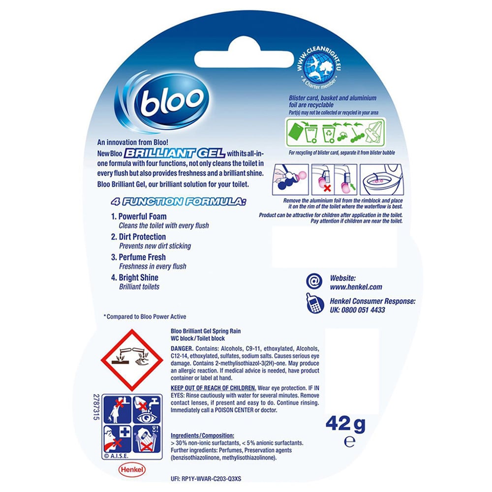 Provide lasting freshness and shine with this Bloo Gel All in 1 Cleaner Spring Rain Toilet Rim Block. Its four-function formula includes power foam for thorough cleaning, dirt protect to prevent new dirt from sticking, and perfume fresh for a subtle, fine fragrance-inspired scent with every flush. It is the perfect way to keep your toilet smelling great and sparkling clean. Pack of 14.
