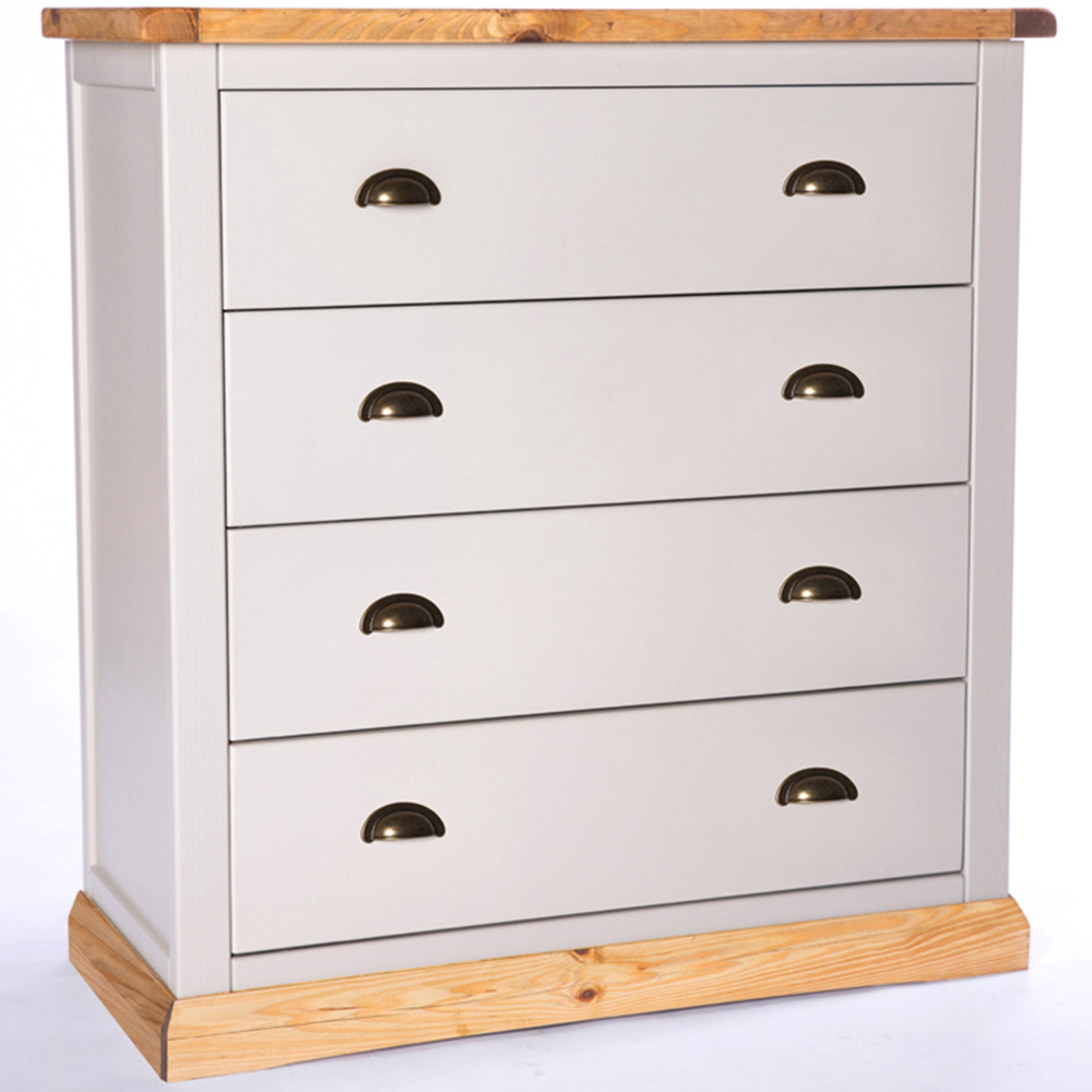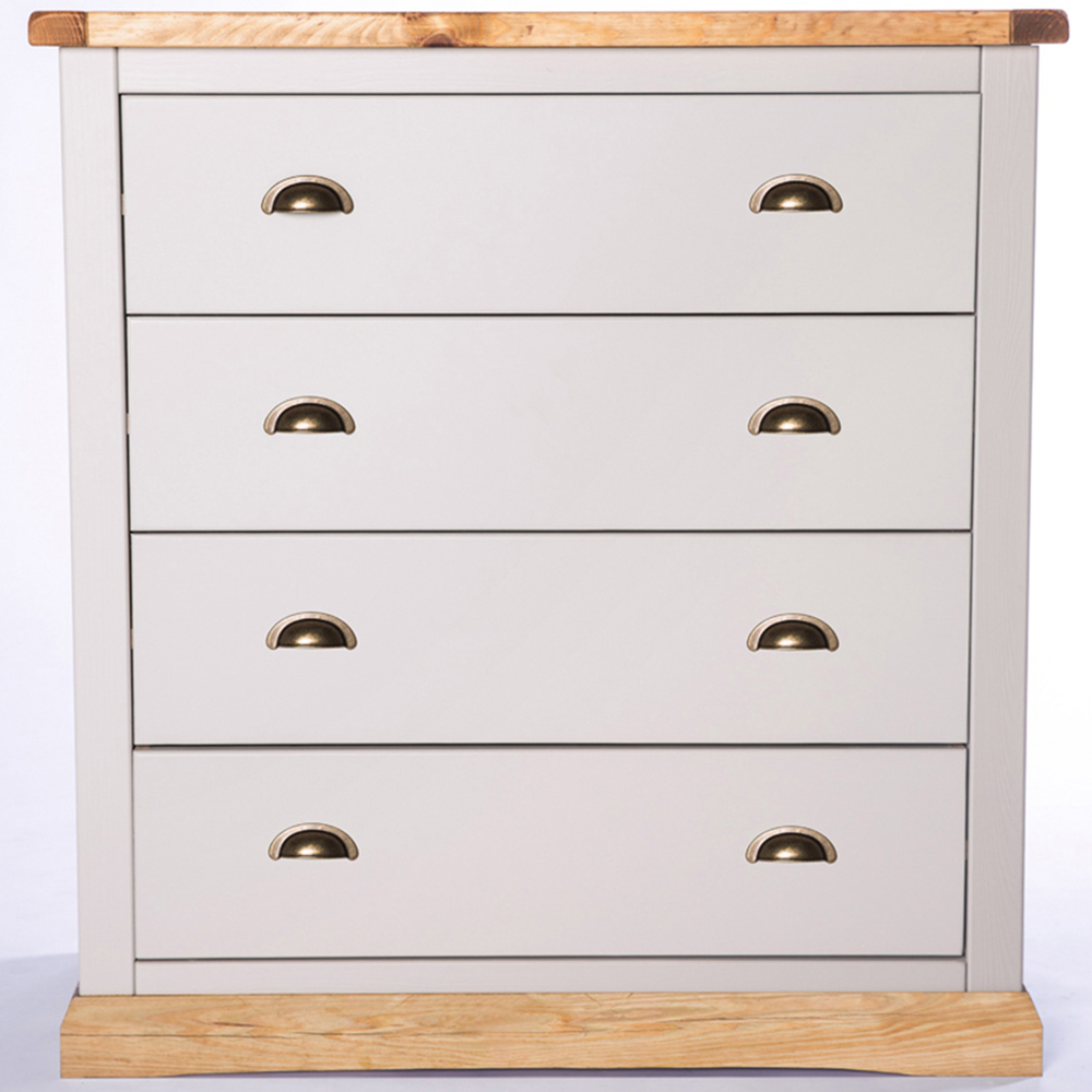 Introduce a calming element to your living space with the Bomporto four-drawer chest of drawers. This light grey storage solution features a waxed pine wood top, perfect for displaying your favourite ornaments such as a clock or decorative item. The unit boasts four drawers, each equipped with elegant brass cup handles, providing generous space for your essentials. The body is hand-finished with an eco-friendly, water-based lacquer. Constructed from a blend of solid pine wood and veneers, it offers a sturdy base for enhanced stability and support. Designed for straightforward home assembly, this chest of drawers effortlessly complements both traditional and contemporary interiors.