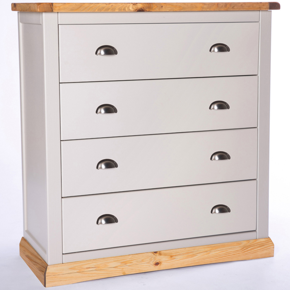 Introduce a calming presence to your living space with the Bomporto Light Grey 4-Drawer Chest of Drawers. Featuring a waxed pine top, ideal for displaying a clock or decorative items, this chest offers both style and practicality. The four drawers, complete with elegant chrome cup handles, provide generous storage for your essentials. The unit's body is meticulously hand-finished with an environmentally conscious, water-based lacquer. Constructed from a blend of solid pine wood and veneers, it boasts a robust base for unwavering stability and support. Designed for straightforward home assembly, this chest of drawers effortlessly complements both traditional and contemporary interior styles.