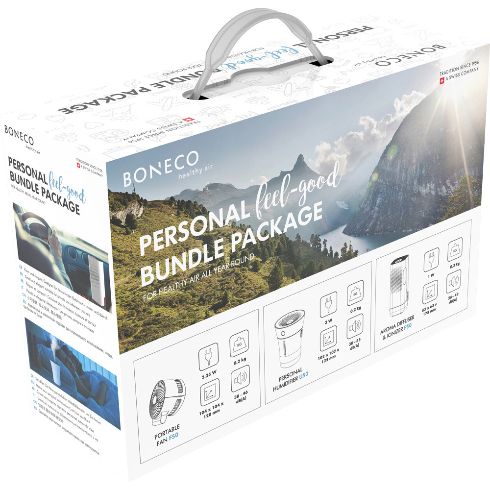 Experience the ultimate in portable comfort with the Boneco Travel Kit. This compact purifier, fan, and humidifier trio is perfect for any environment—home, office, or on the go. Enjoy clean, fresh air with the personal purifier, combat dry winter air with the elegant humidifier, and stay cool with the portable fan. USB-operated, this versatile kit measures 102 x 102 x 135mm.