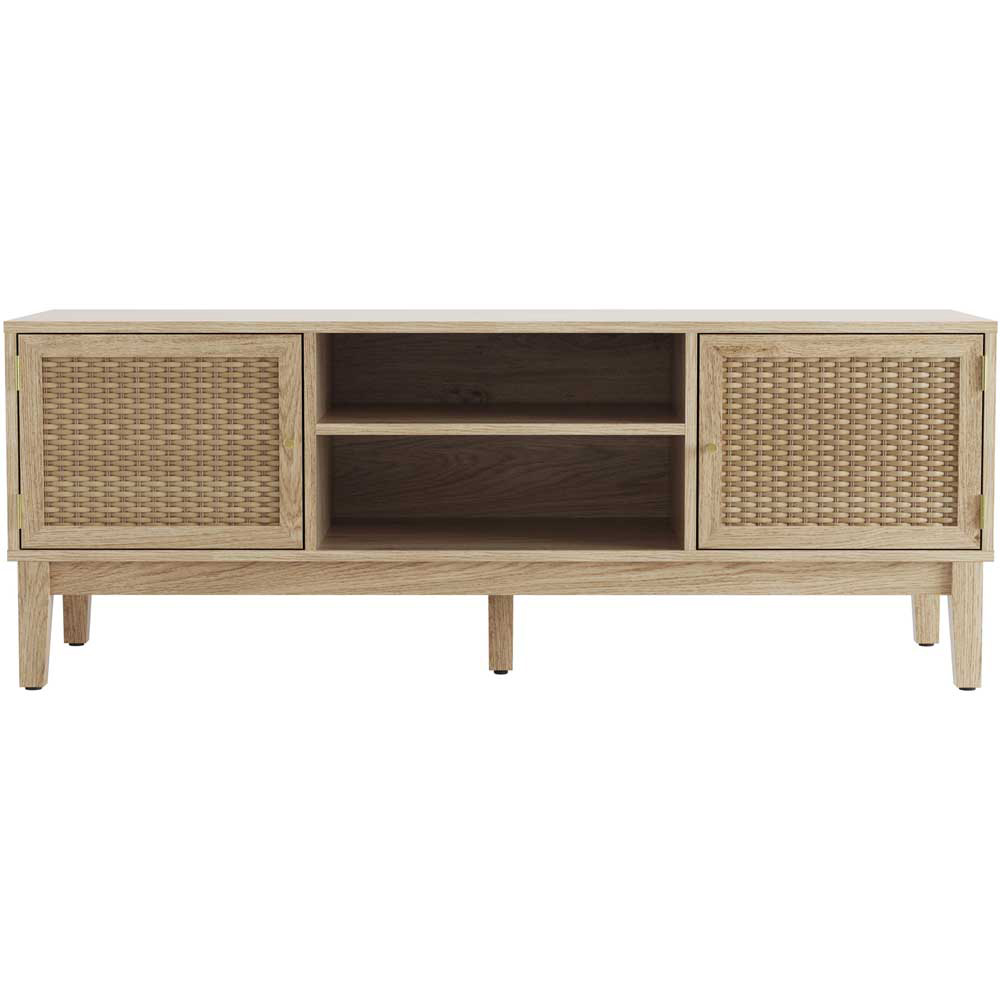 Elevate your living space with the Bordeaux Oak Effect TV Unit, a stylish fusion of modern and bohemian aesthetics. This unit features a striking design, combining wooden frames with on-trend rattan fronts and gold fittings and handles for a touch of luxury. Two cupboards on either end and open central shelving provide ample storage, keeping your space organized and clutter-free. The unit's wooden legs allow for easy cleaning beneath.