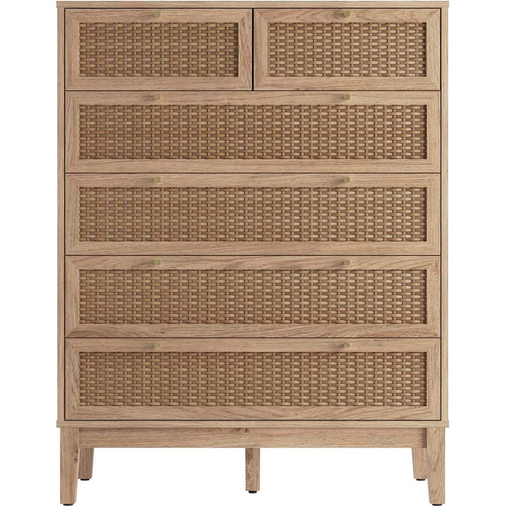Add a touch of modern boho style to your home with the LPD Furniture Bordeaux 6 Drawer Oak Effect Storage Chest. This stylish chest boasts a unique design, combining wooden frames with on-trend rattan drawer fronts and gold fittings and handles. With six drawers, you',ll have ample space to store all your essentials.