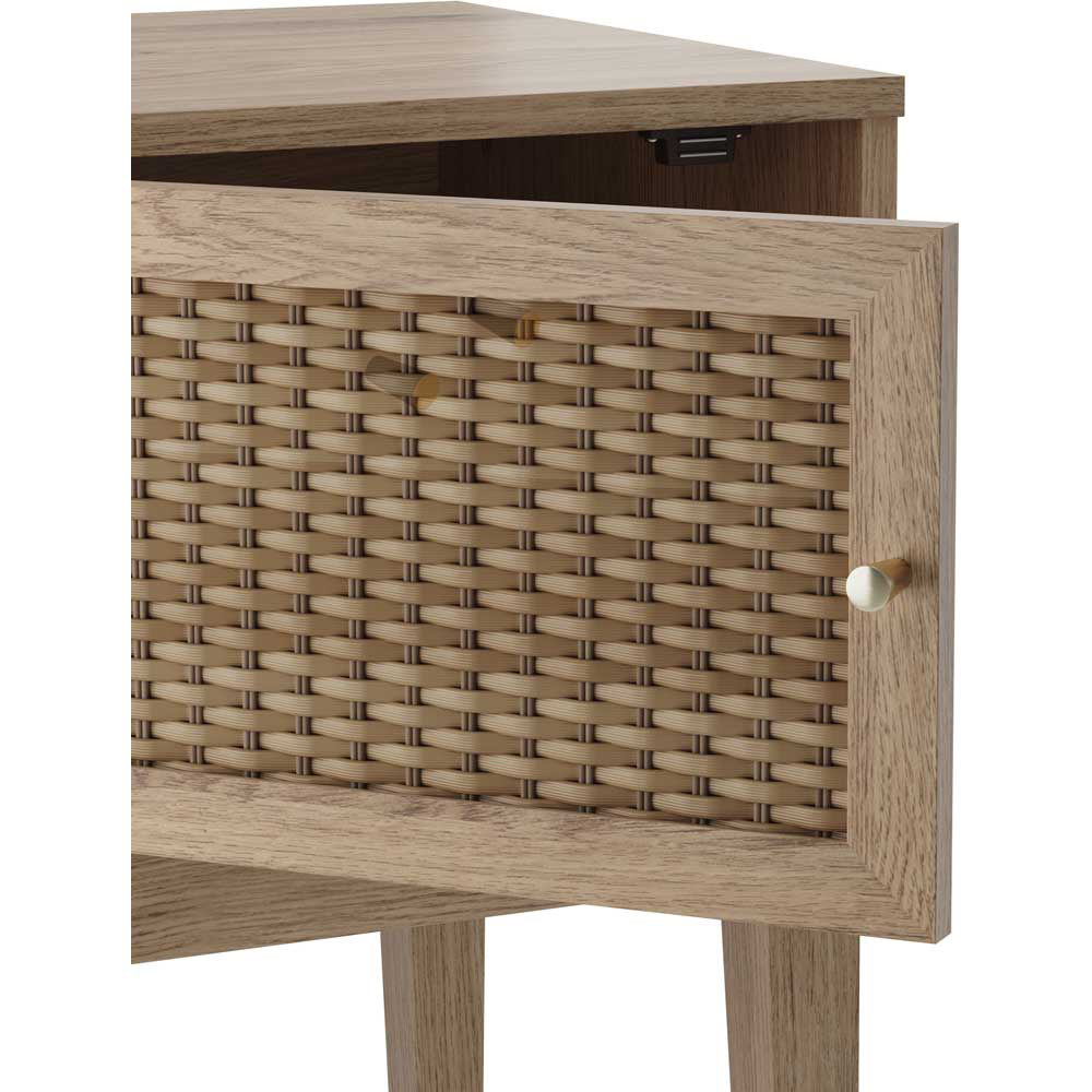Elevate your bedroom's style with the Bordeaux single drawer bedside table. Its oak effect finish and on-trend rattan drawer front create a sophisticated yet modern feel. Gold fittings and handles add a touch of luxury, while the drawer provides convenient storage for bedside essentials. The tabletop offers the perfect spot for a lamp or decorative objects.