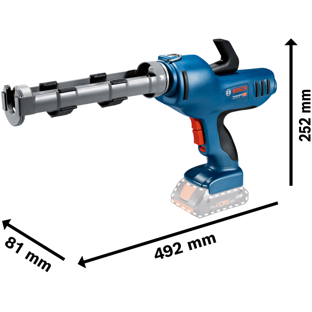 Power through caulking projects with the Bosch 18V Professional Caulking Gun. This tool handles all types of caulk and adhesive cartridges with ease. Nine speed settings and a variable speed trigger provide precise material flow control, even with high-viscosity adhesives. Its 3.5 kN push force and 7 mm/sec maximum feed rate ensure fast progress. The auto-reverse function eliminates dripping and overflow by relieving pressure on the plunger rod when the trigger is released. This caulking gun is a bare unit—battery and charger sold separately. Compatible with all Bosch Professional 18V batteries, including ProCORE18V batteries, chargers, and AMPShare. Specifications: 3.5 kN push force, 7 mm/sec feed rate, 310ml cartridge capacity, 2 kg weight (excluding battery.