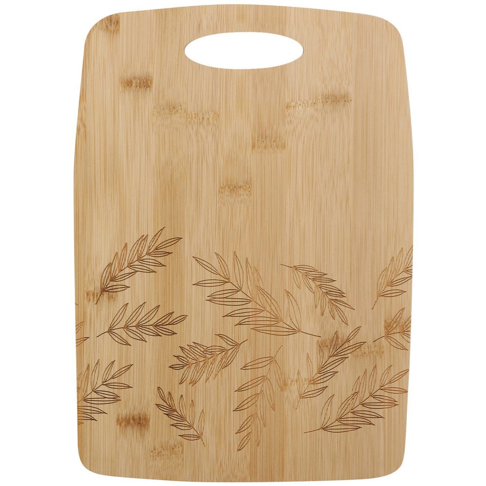 Elevate your kitchen prep with the Botanical Bamboo Cutting Board. Its convenient cut-out handle and stylish laser-etched botanical leaves on the lower half make it as practical as it is attractive. Perfect for chopping vegetables or creating an elegant serving platter.