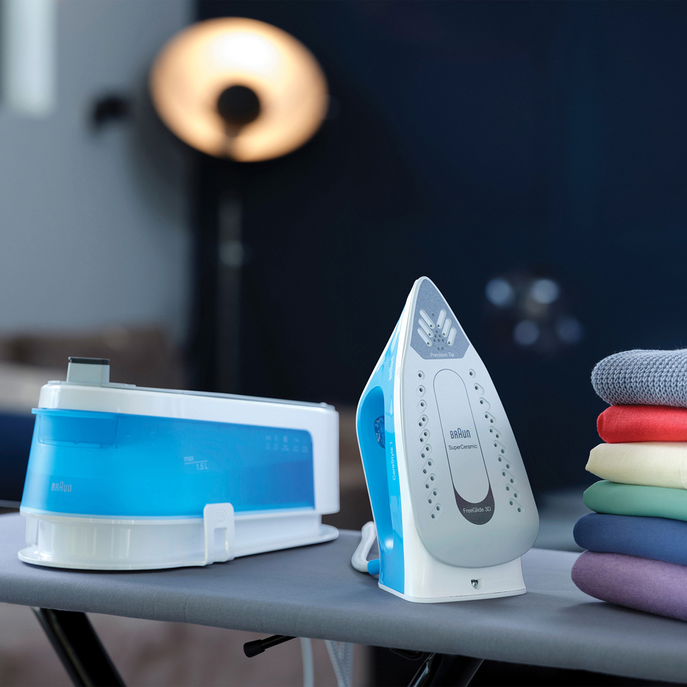 Iron through your washing pile with impressive speed thanks to the Braun BN1122 Steam Iron. Featuring innovative Double Steam technology, this iron generates twice the steam of standard models, cutting ironing time by up to 50%*. Experience effortless gliding with the patented Free Glide 3D technology, boasting an upwards-curving soleplate for 360° movement over any fabric, navigating buttons and embellishments with ease. A powerful steam shot of up to 340g/min tackles even stubborn creases. The generous 1.5L removable water tank supports extended ironing sessions without frequent refills, while the 4-level adjustable temperature gauge provides tailored precision for all fabric types. The Easy CalcClean system, complete with a reminder function, ensures effortless maintenance and optimal performance.